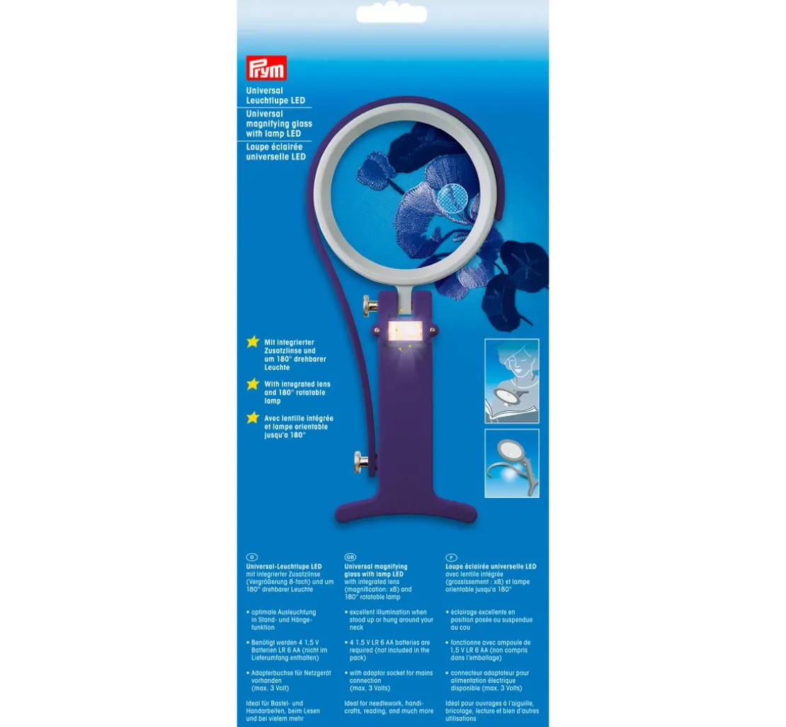 Eine hochwertige Prym Universal Leuchtlupe mit LED-Leuchtmittel. Die Leuchte ist um 180 ° drehbar. Die Lupe hat eine 2-fache Vergrößerung und ist mit einer Zusatzlinse ausgestattet die eine 8-fache Vergrößerung bietet.