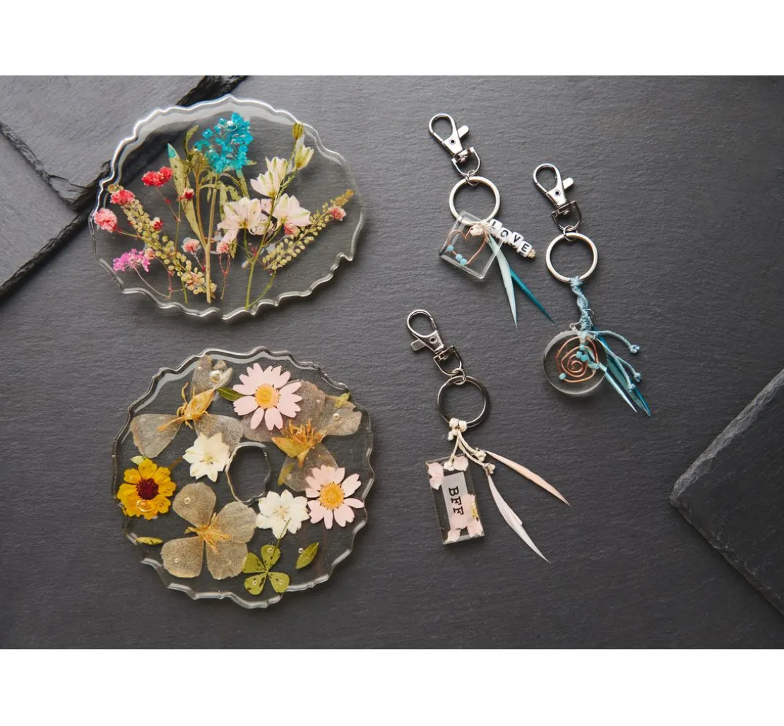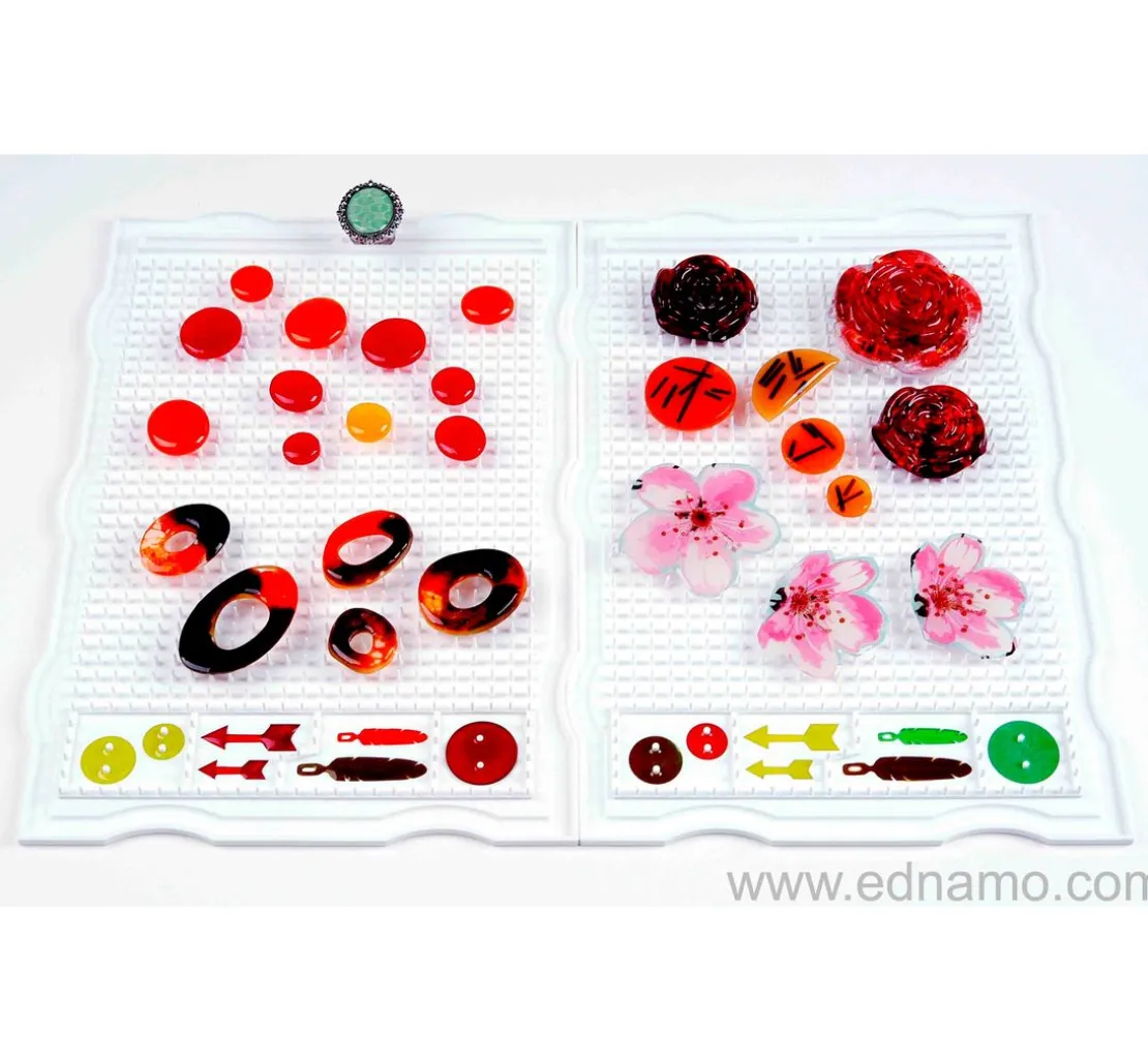 Praktische Ringhalterungen sowie die passenden Schlitze zum Fixieren und sieben Formen für das individuelle Gießen von zum Beispiel Knöpfen, sind in dem Résin’Pad enthalten.