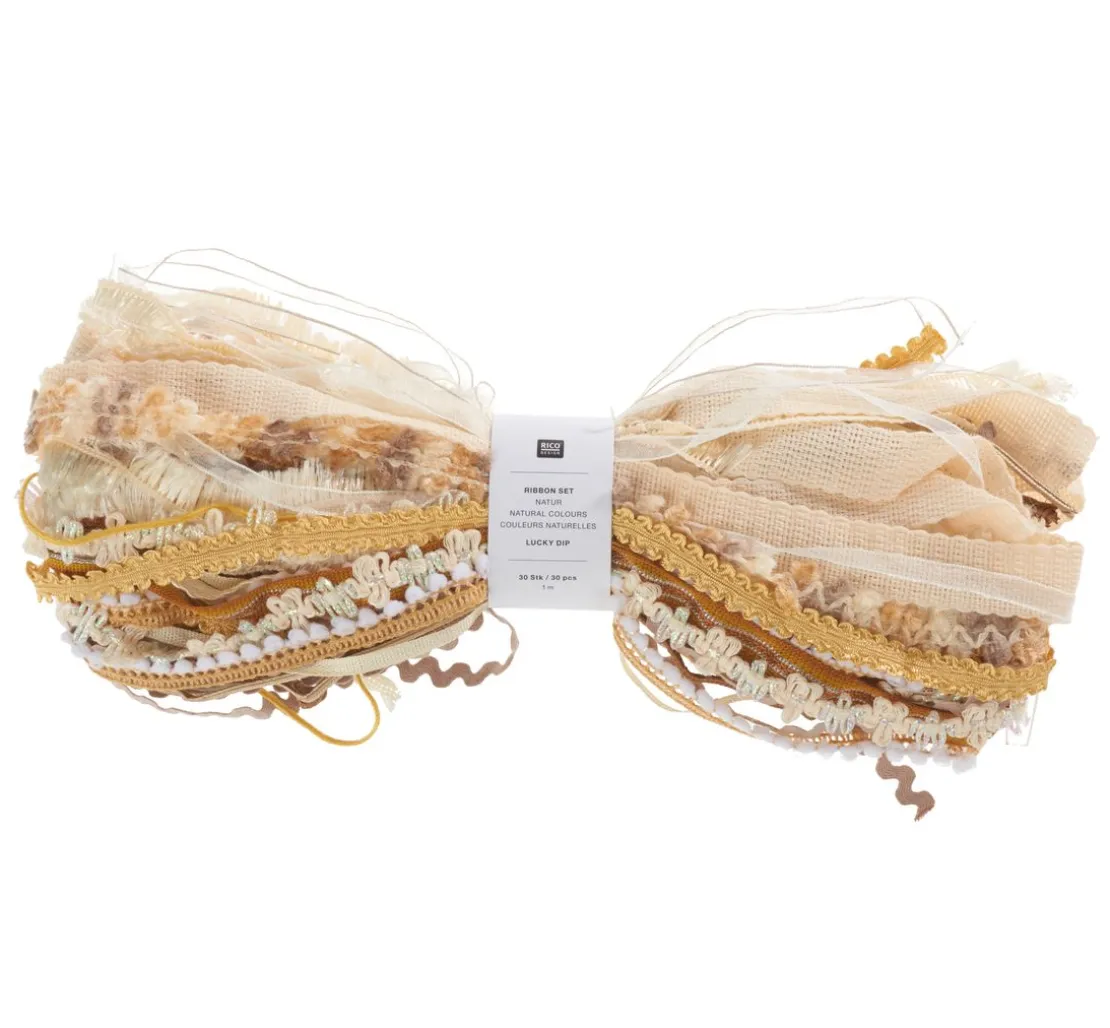 Das Rico Design Bänder-Set „Lucky dip“, Natur ist eine zufällige Zusammenstellung von 30 Bastelbändern in natürlichen Farben für vielseitige Gestaltungsmöglichkeiten. Jedes Bastelband besteht aus 100 % Polyester und hat eine Länge von ca. 1 m.