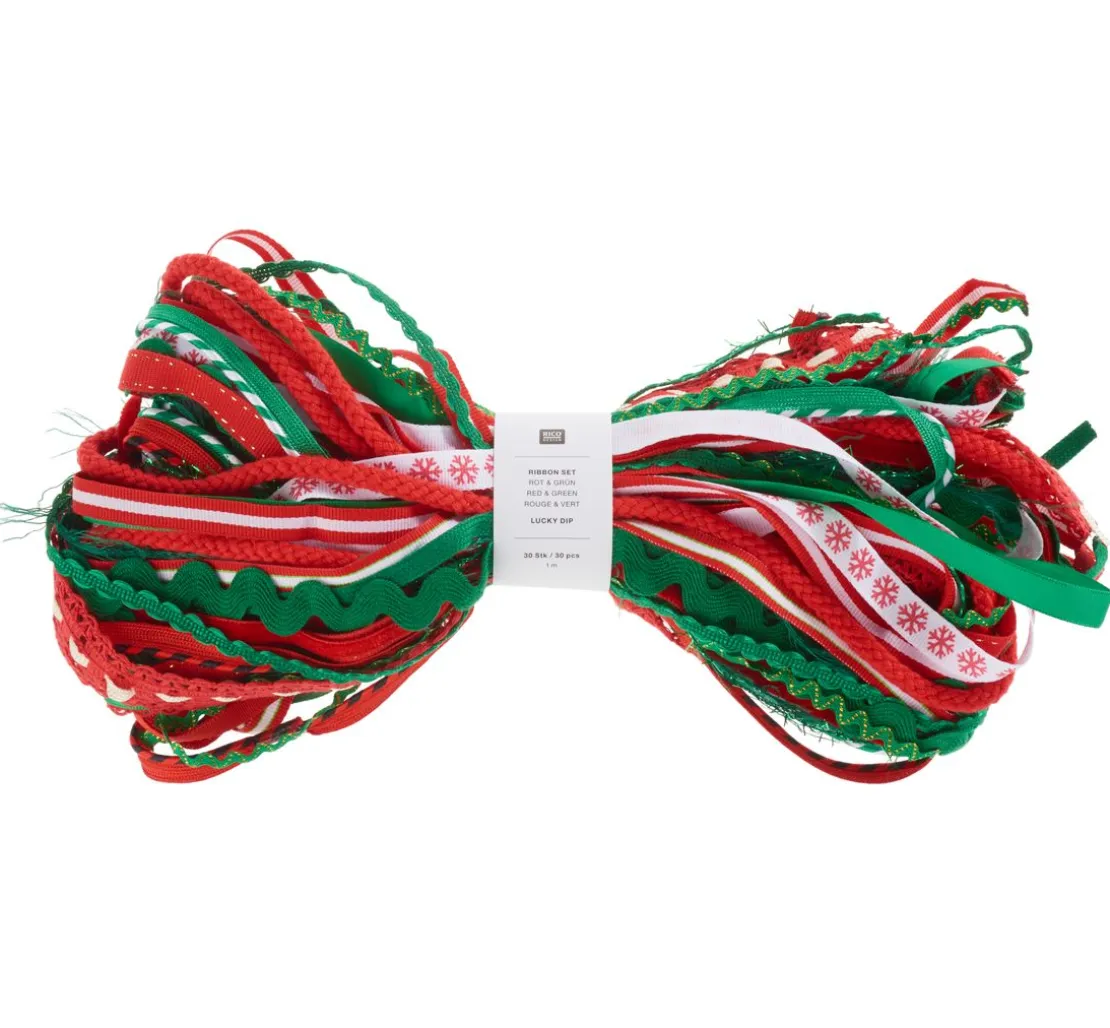 Das Rico Design Bänder-Set „Lucky dip“, Rot-Grün ist eine zufällige Zusammenstellung 30 verschiedener Bastelbänder in der Farbrichtung Rot und Grün. Jedes Band besteht aus 100 % Polyester und hat eine Länge von ca. 1 m.