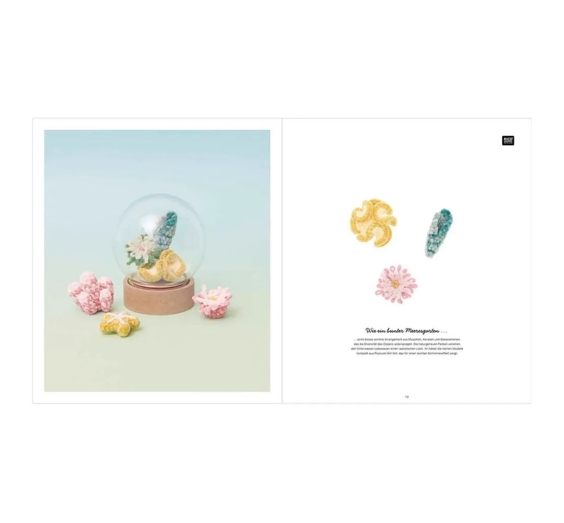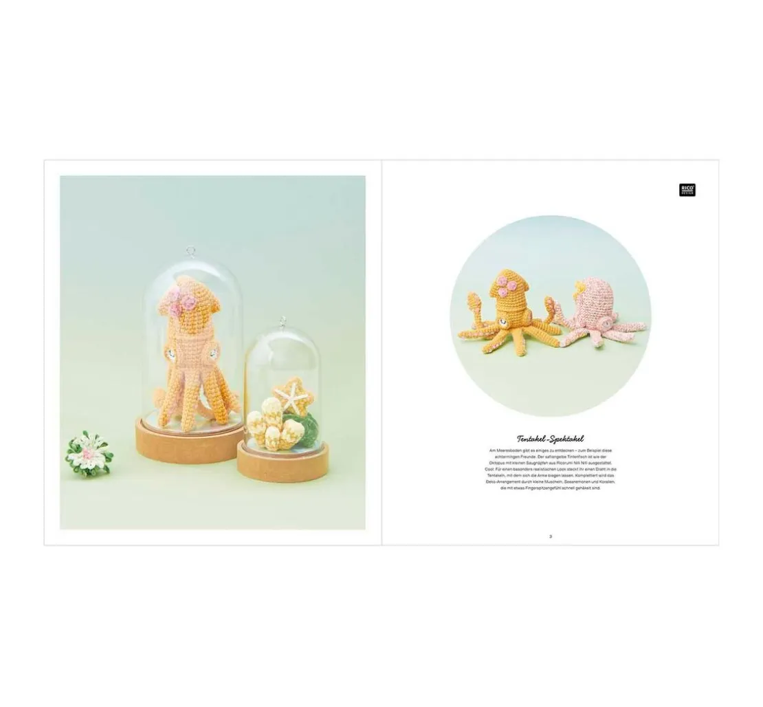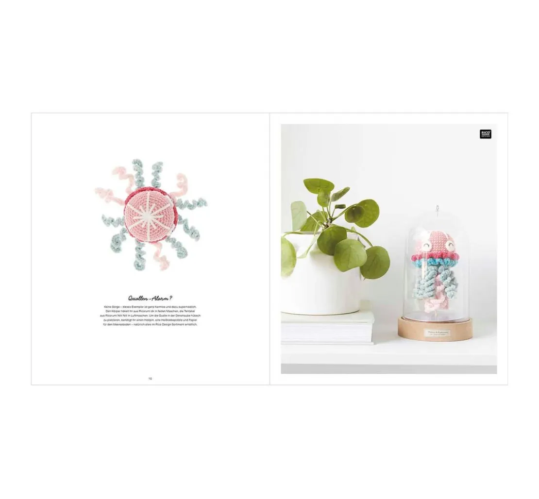 Die Rico Design Ricorumi Underwater World kombiniert die Klassiker Ricorumi dk und Ricorumi Spray dk mit Ricorumi Nilli Nilli, mit einem matt glänzenden Flauschgarn mit Chenille-Struktur. Mit dieser Kombination kannst du Tintenfische, Seesterne, Anemonen, Putzerfische, Meeresnacktschnecken und andere Unterwasser Lebewesen häkeln. In Kombination mit den Dekohauben werden die Modelle zu stimmungsvollen Homedeko-Objekten.