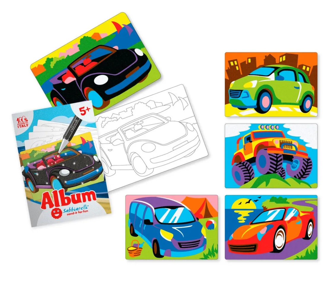 Ein Sabbiarelli Sand-it for Fun Album Cars mit einem Inhalt von 5 Motiven in der Größe 15 x 20 cm. Es handelt sich hier um vorgeschnittene und vorgeklebte Motive zum Bemalen mit Sand (nicht enthalten).