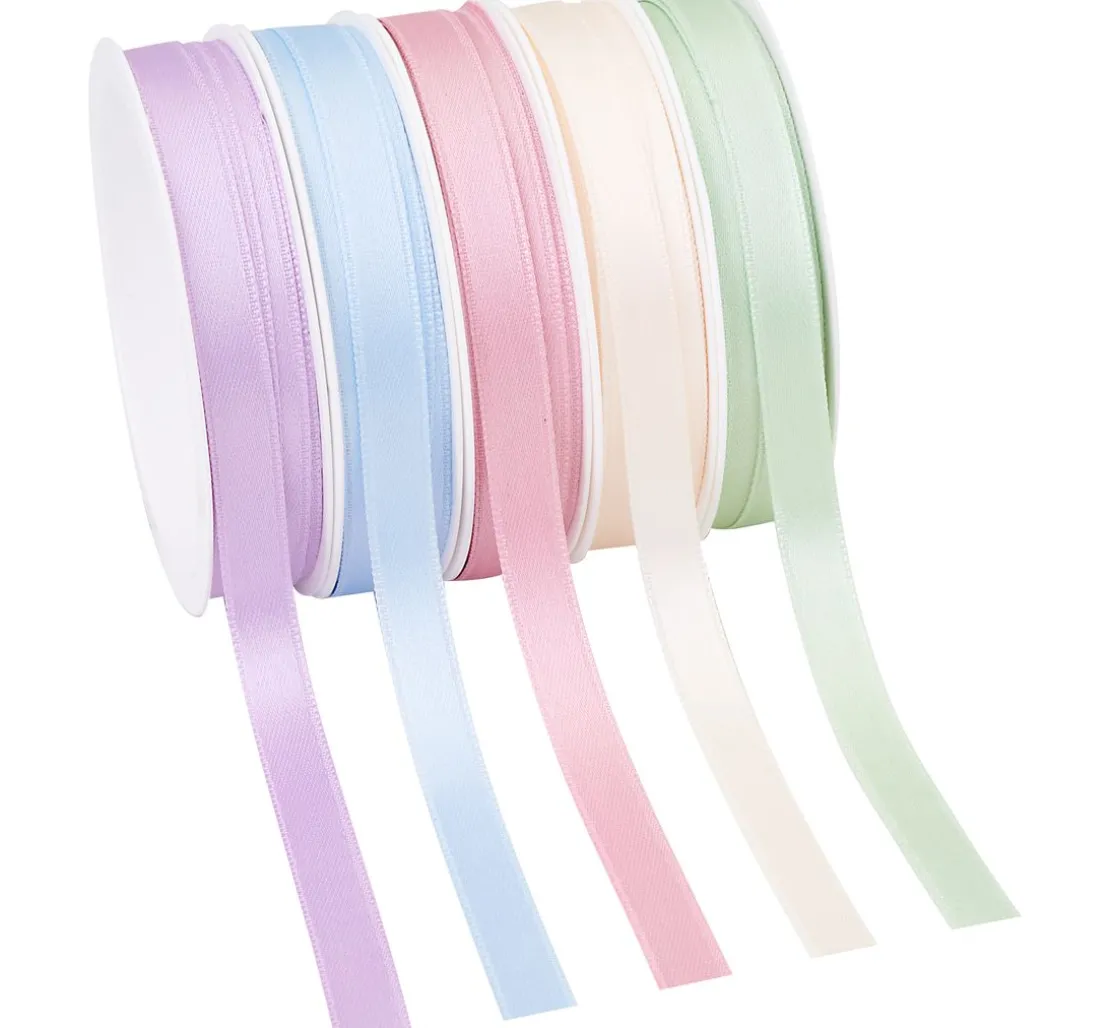 Zartes Satinband „Pastell“ bestehend aus 5 hellen Farben mit einer Breite von ca. 10 mm und einer Länge von ca. 3 m. Die Bänder sind aus 100 % Polyester hergestellt.
