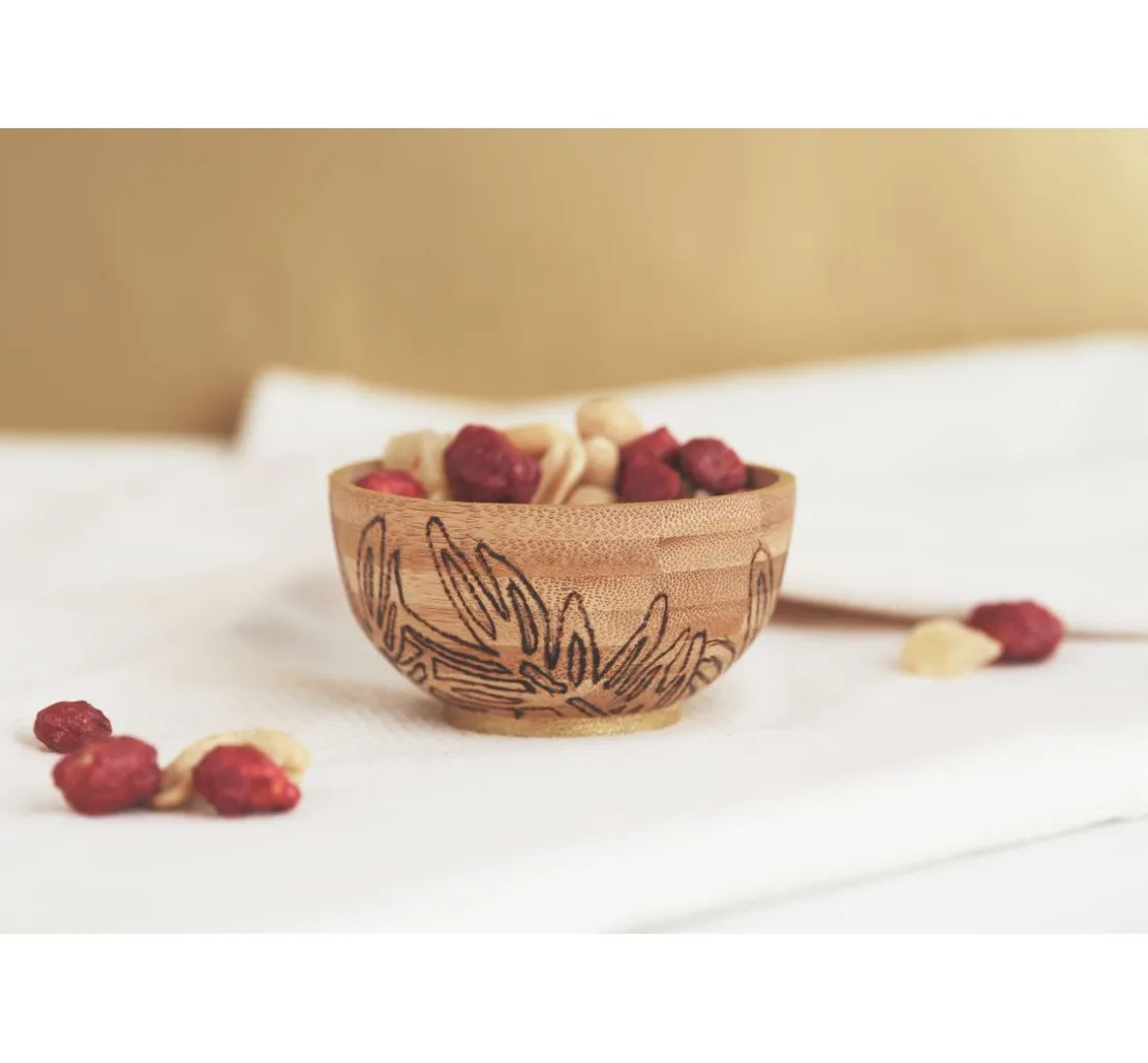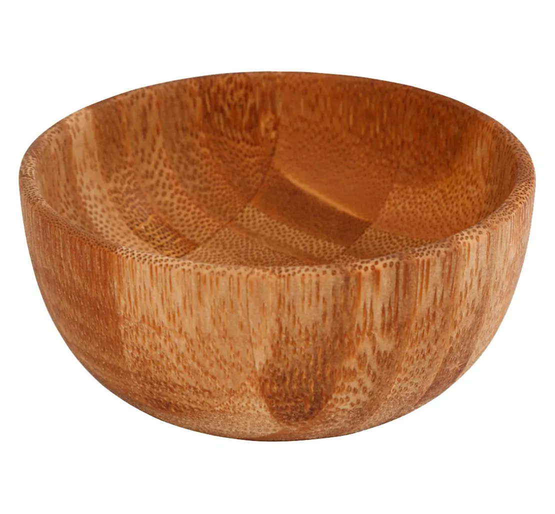 Ein Schälchen aus Bambus mit einem Ø von ca. 8 cm und eine Höhe von ca. 4,5 cm. Eine kleine Schale mit einer feinen Holzstruktur. Sehr schönes Holz, behandelt mit einem natürlichen, lebensmitteltauglichen Öl. Für eine längere Lebensdauer sollte diese Bambus-Schale von Hand gespült werden.