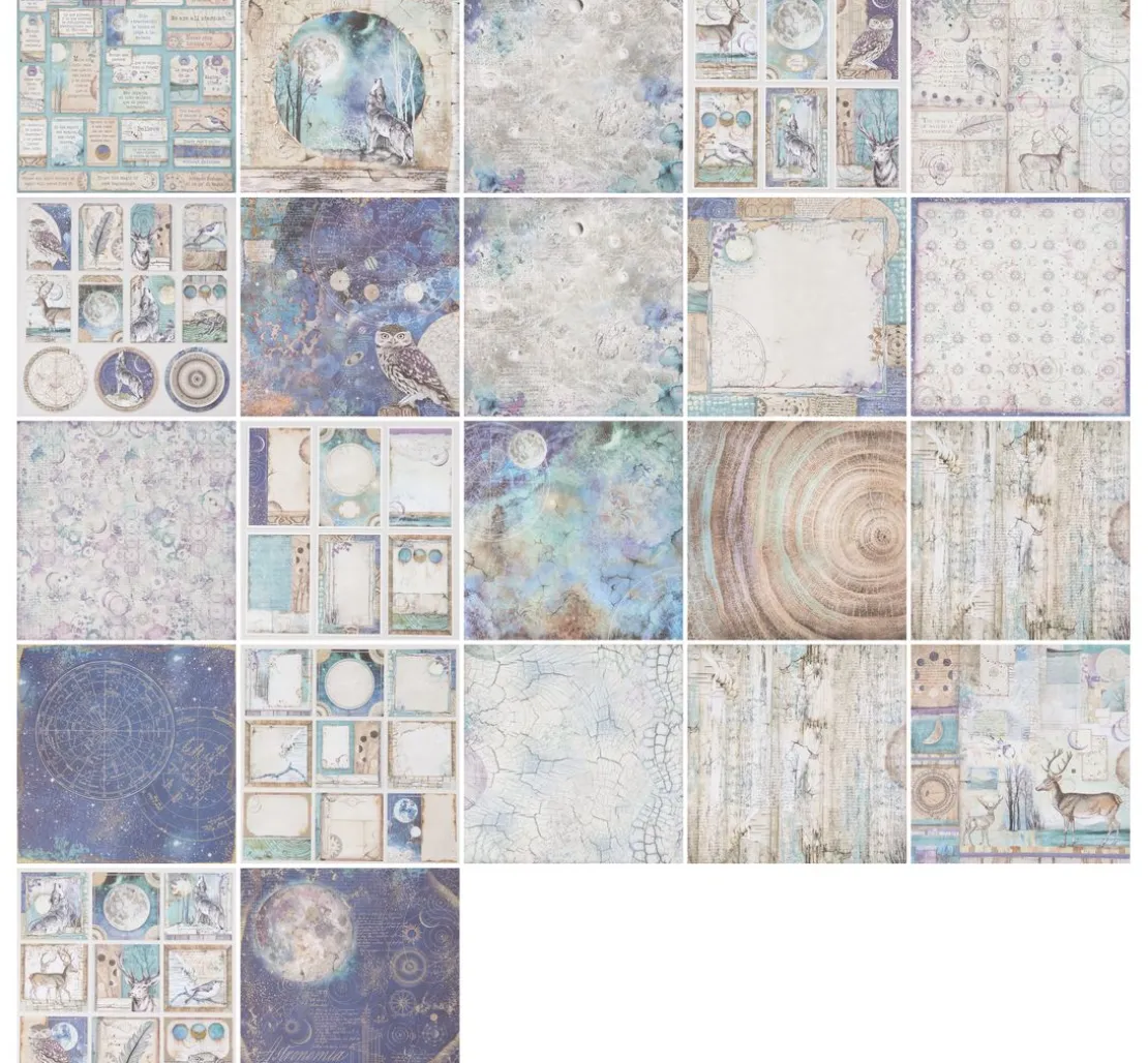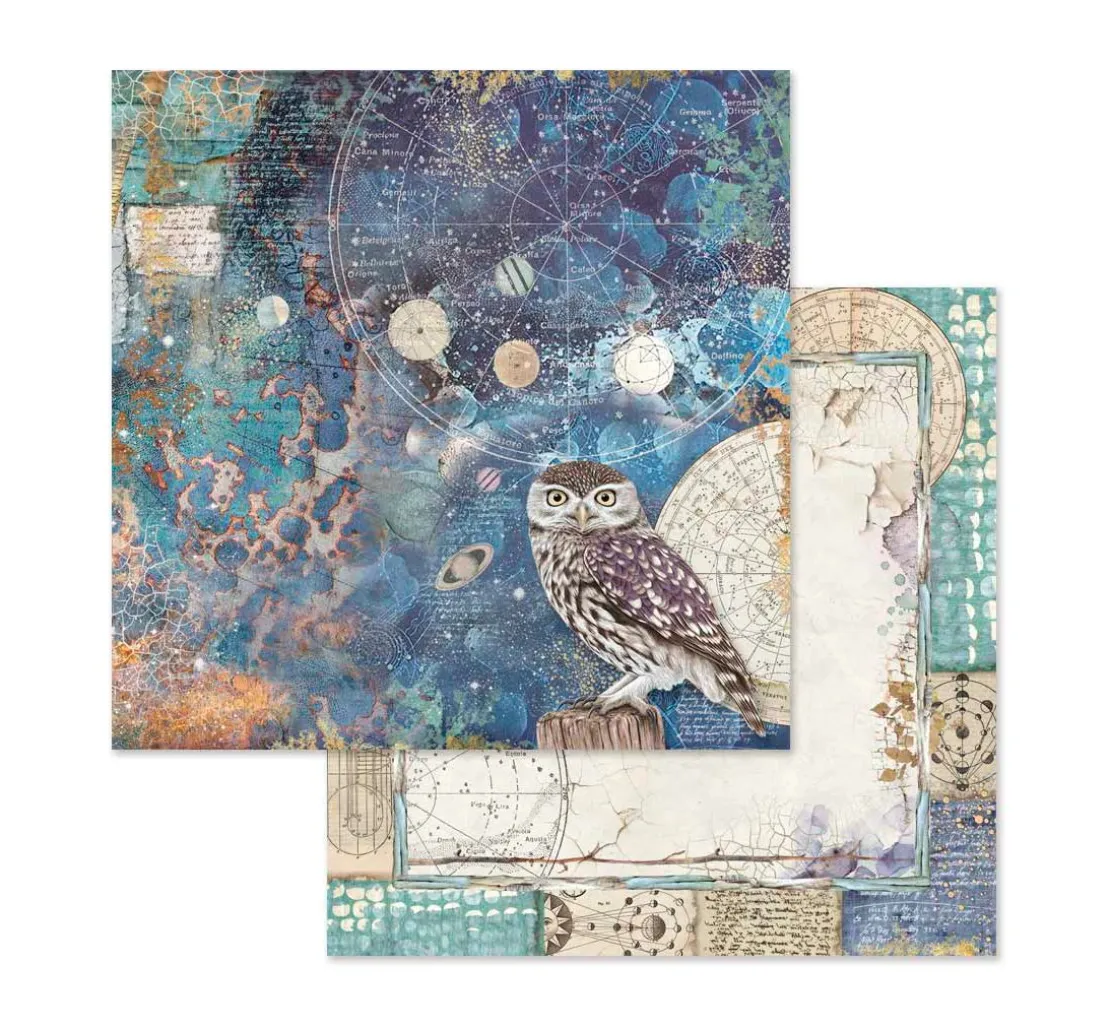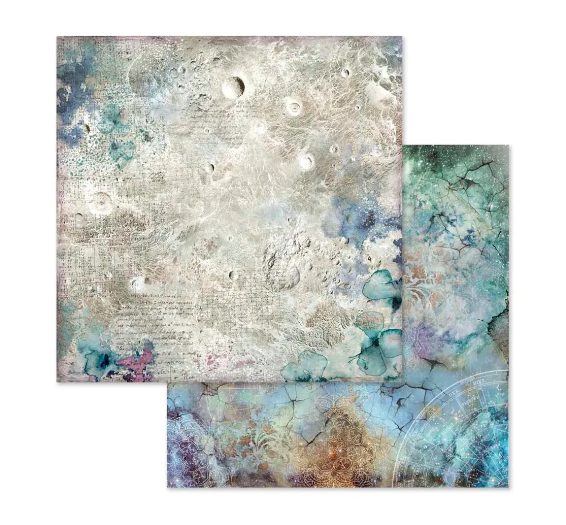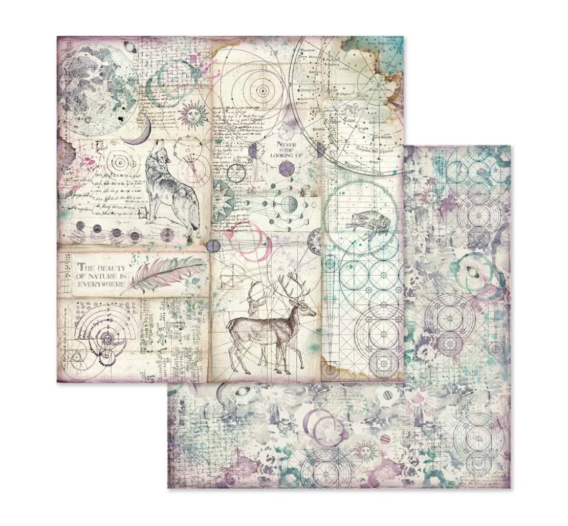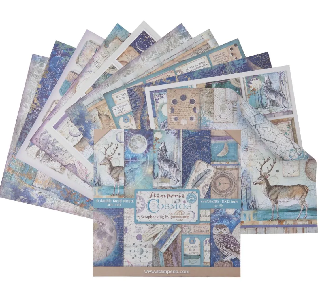 Toller ca. 30,5 x 30,5 cm großer Scrapbook-Block „Cosmos“. Auf 10 Bogen, die jeweils beidseitig mit verschiedenen Motiven bedruckt sind, werden wunderschöne Motive und Illustrationen zum Thema Cosmos dargestellt. Er zeigt sowohl astrologische Bilder und Schriften, als auch mystische Tiere und Darstellungen aus der Natur. Die Bogen haben je ein Gewicht von ca. 190 g/m². Der Motivblock ist überwiegend in den Farben Blau, Lila, Braun und Weiß gehalten.