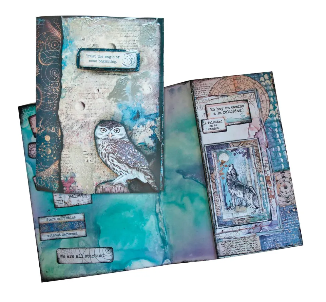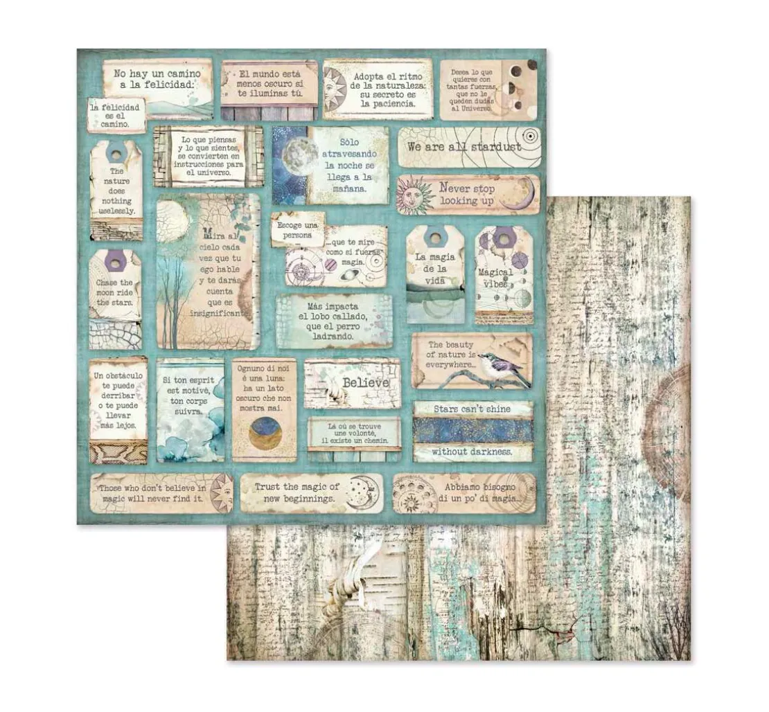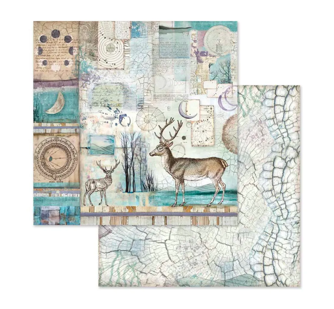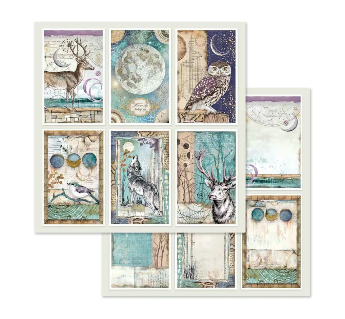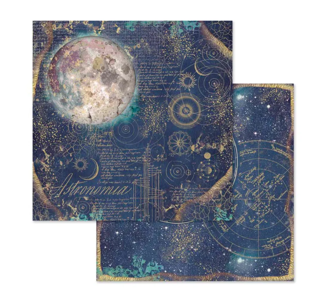 Toller ca. 30,5 x 30,5 cm großer Scrapbook-Block „Cosmos“. Auf 10 Bogen, die jeweils beidseitig mit verschiedenen Motiven bedruckt sind, werden wunderschöne Motive und Illustrationen zum Thema Cosmos dargestellt. Er zeigt sowohl astrologische Bilder und Schriften, als auch mystische Tiere und Darstellungen aus der Natur. Die Bogen haben je ein Gewicht von ca. 190 g/m². Der Motivblock ist überwiegend in den Farben Blau, Lila, Braun und Weiß gehalten.