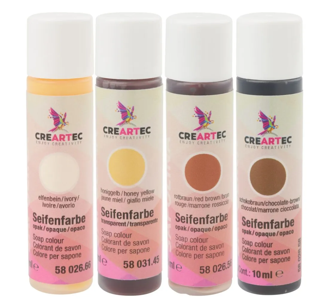 Dieses Seifenfarben Set „Caffee Latte“ enthält die Farben Elfenbein, Honiggelb, Rotbraun und Schokobraun mit einem Inhalt von je 10 ml.