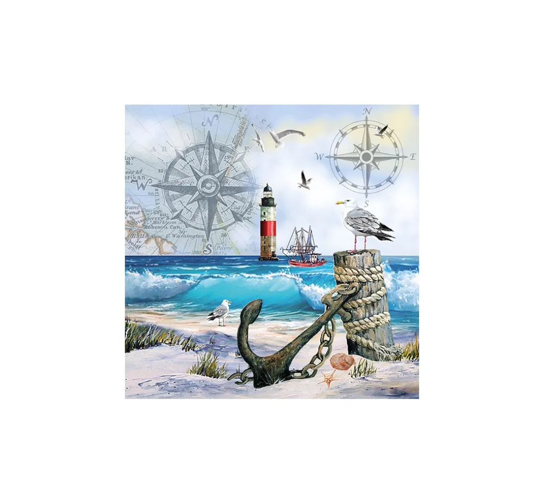Die detailreiche Serviette „Ankerplatz“ ist in Blau gehalten und zeigt einen Strand mit vielen Möwen, Anker, Schiff, Leuchtturm und Kompassen. Das viertel Motiv ist super für maritime Dekorationen.