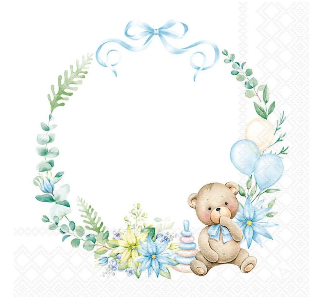 Tauche ein in die zauberhafte Welt der Serviettentechnik mit der Serviette „Baby Teddy“. Das bezaubernde Motiv, ein Teddybär umrahmt von Blättern und Blüten, lädt zum kreativen Gestalten ein. Hebe damit Babygeschenke beim Gestalten von Bilderrahmen oder Schmuckschatullen hervor. Dank Serviettenlack überträgst du das Design mühelos auf Glas, Stoff, Metall und mehr.