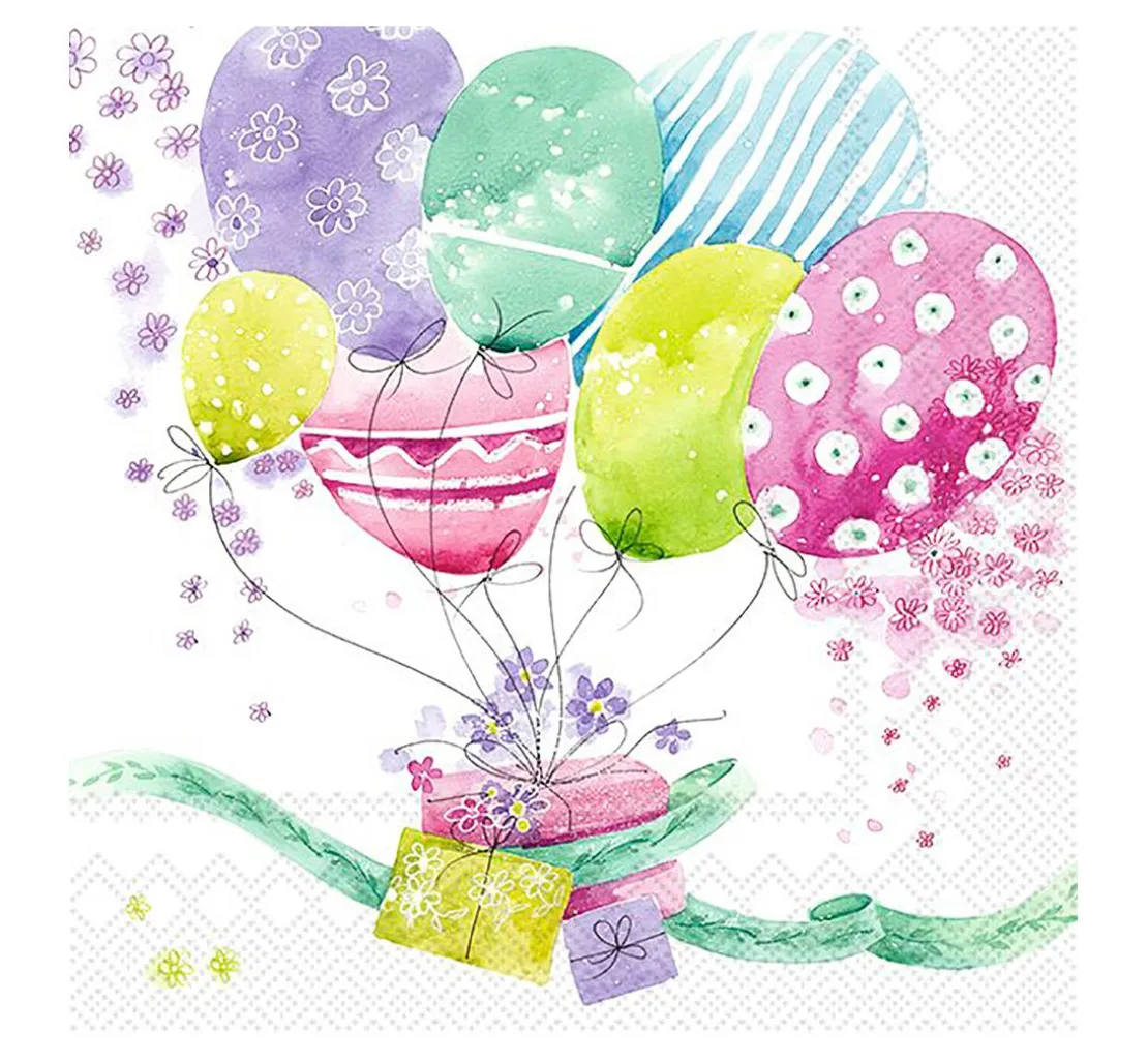 Bunte Serviette „Ballon Mix“ als viertel Motiv mit Geschenken, die an vielen Ballons hängen. Ein super Serviettenmotiv für die Gestaltung des Geburtstagstisches oder für das Verzieren mit der Serviettentechnik auf Schachteln, Boxen und Tüten. So werden Geschenkverpackungen ganz individuell.