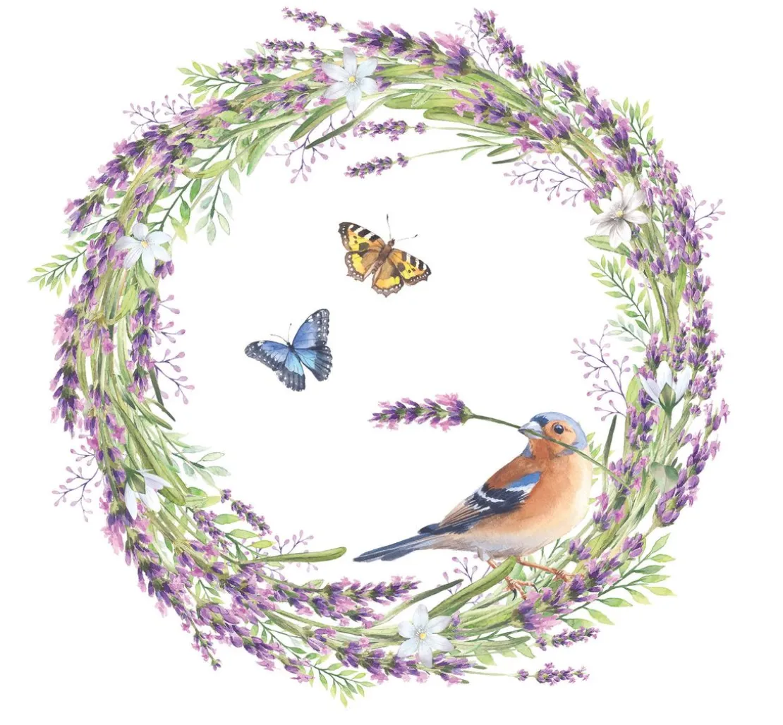 Entdecke die Serviette „Buchfink im Lavendelkranz“ von Ambiente und tauche ein in eine frühlingshafte Welt voller Kreativität und DIY-Möglichkeiten. Das Motiv zeigt einen wunderschönen Kranz aus Lavendel, in dem ein niedlicher Vogel sitzt. Mit dieser Serviette kannst du deine Bastelprojekte auf eine ganz besondere Art und Weise gestalten.