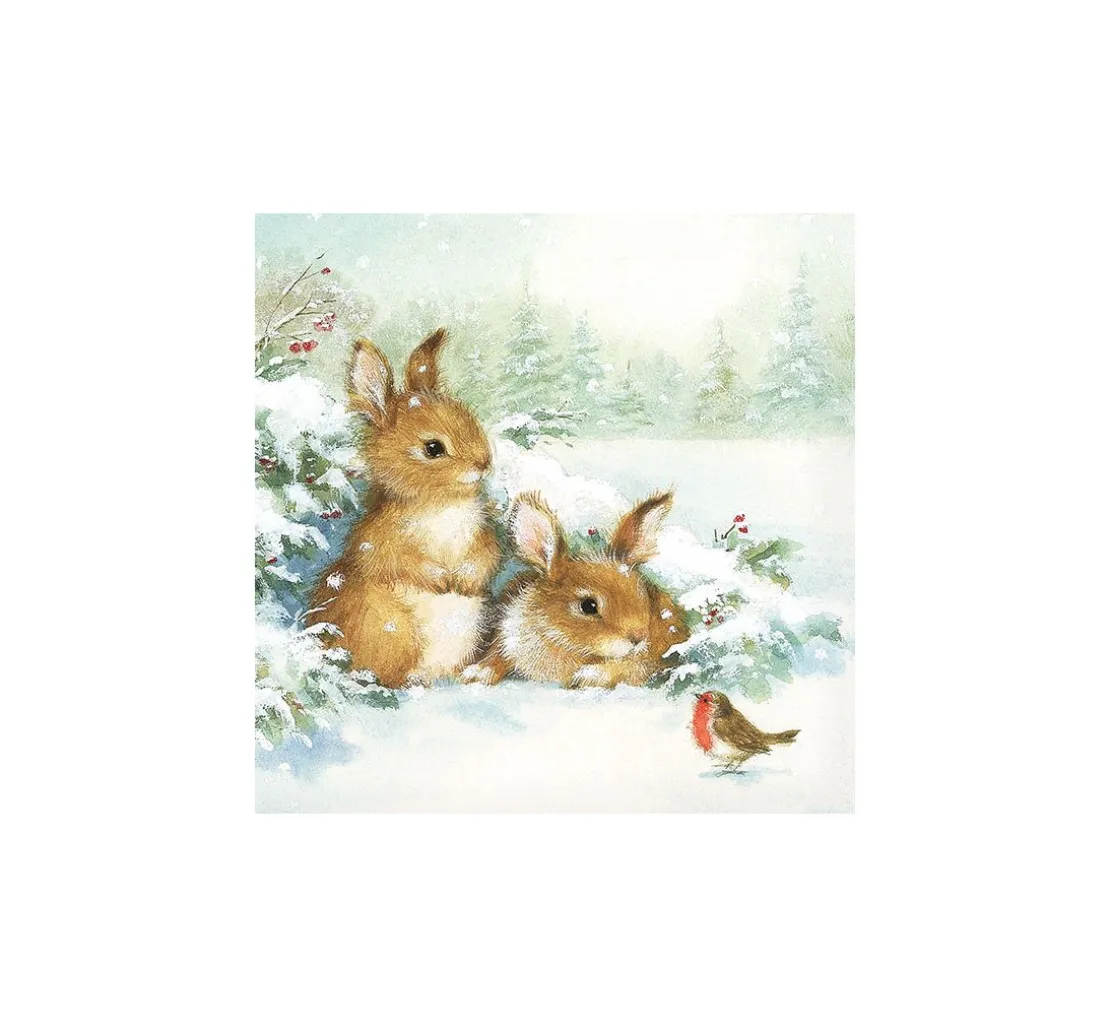 Winterliche Dekorationen lassen sich mit dieser Serviette „Freunde im Schnee“ toll umsetzen. Es handelt sich um ein viertel Motiv mit einem verschneiten Winterwald und zwei niedlichen Hasen und einem Rotkehlchen im Schnee.