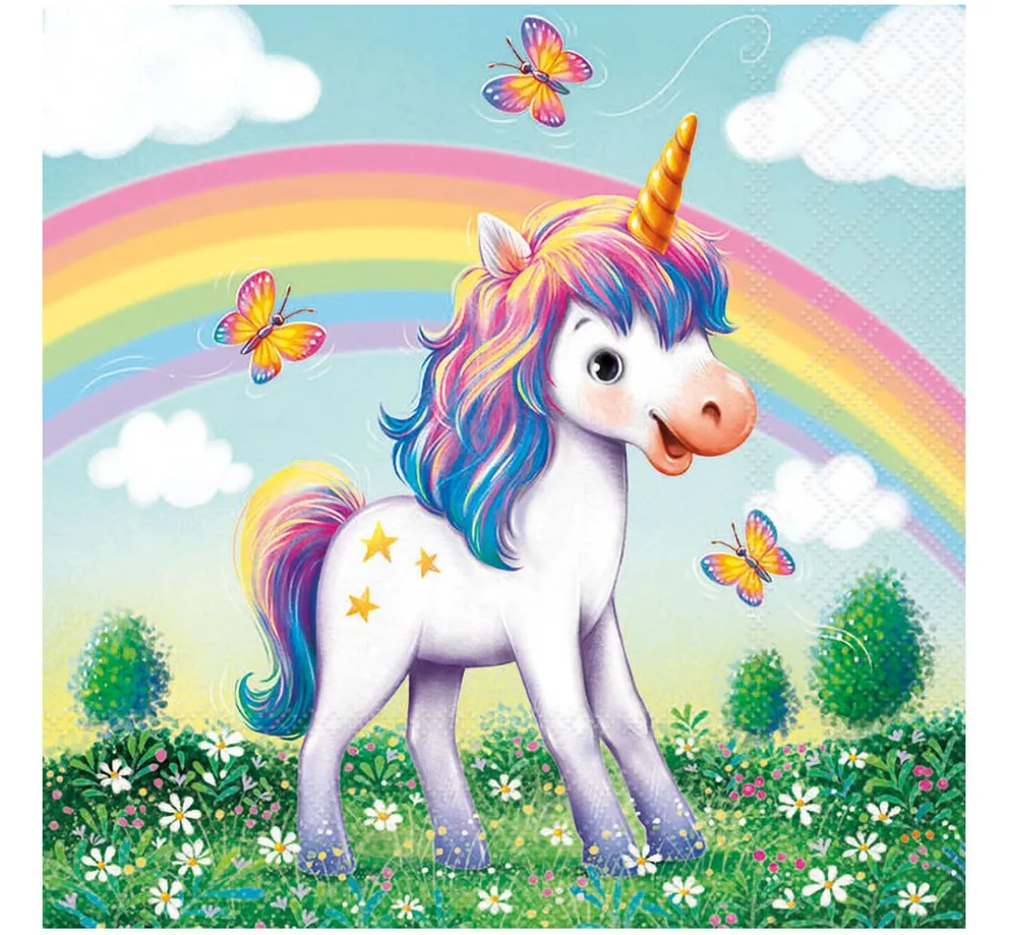 Das hinreißende Motiv aus Einhorn, Schmetterlingen und Regenbogen verschönert jede Tischdeko und bietet wunderbare Möglichkeiten für die Serviettentechnik. Übertrage es mit Serviettenlack auf Stoff, Keramik, Karton, Glas oder Metall und gestalte fantasievolle Vasen oder personalisierte Bilderrahmen.