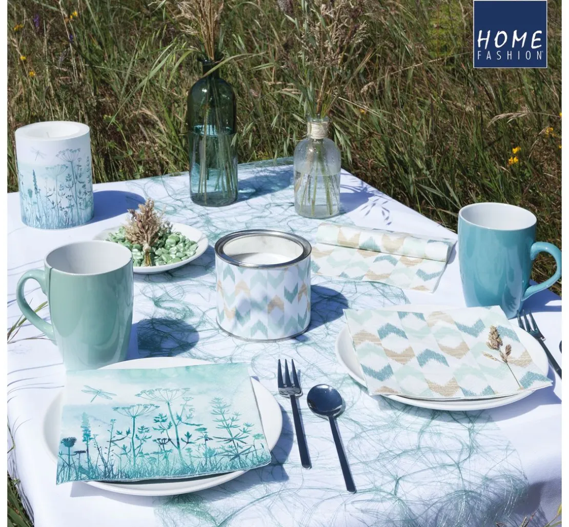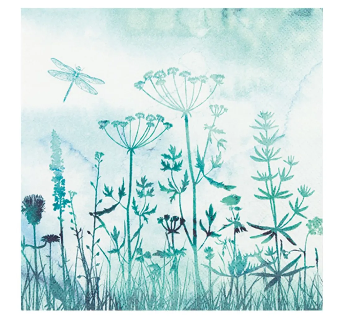 Eine Libelle fliegt auf der Serviette „Libelle„ Aquarell am See entlang und es zeigt sich eine schöne Landschaft mit Aquarellfarben in Türkis. Das halbe Motiv der Serviette eignet sich gut für größere Flächen.