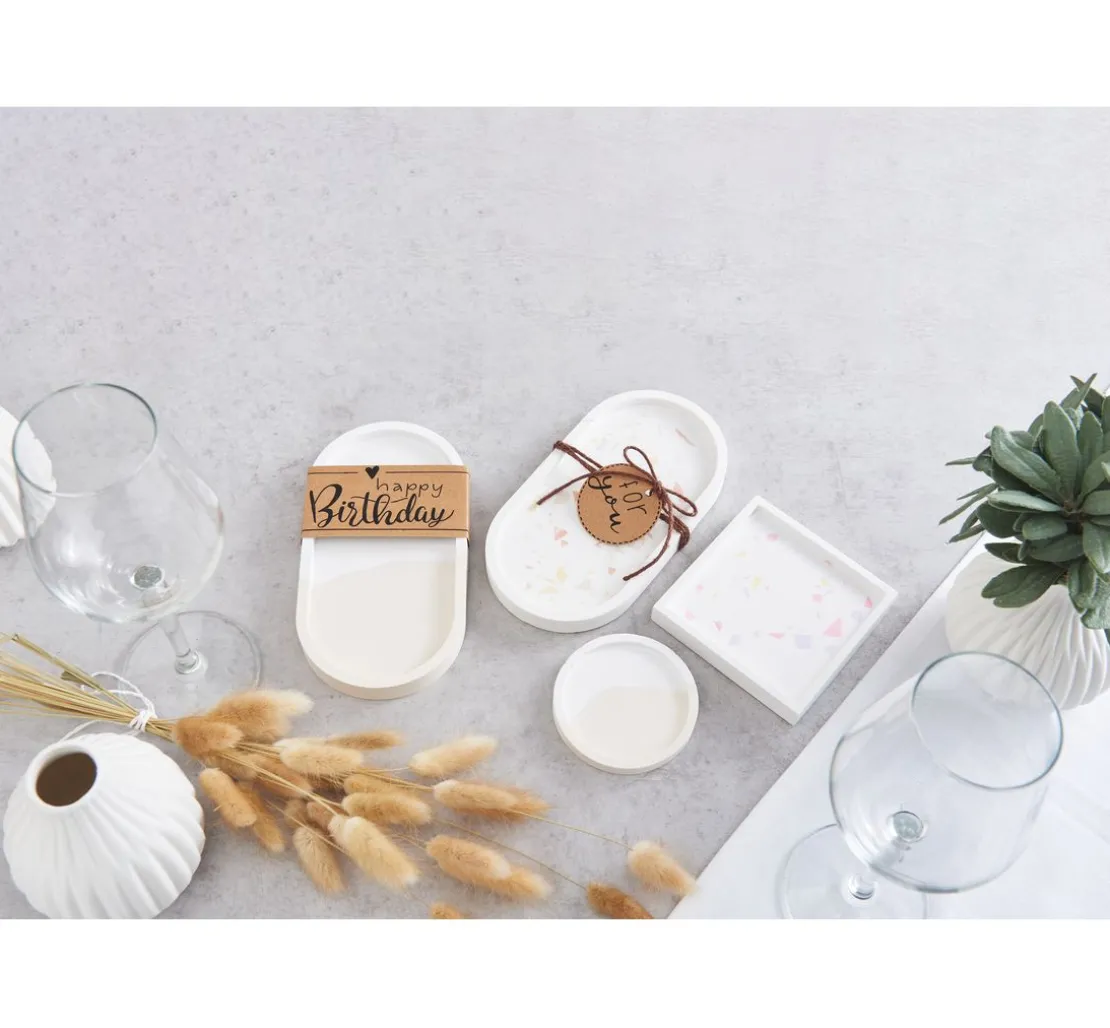 Der ausgehärtete Untersetzer kann nach Belieben mit Bastelfarben, Handlettering und Glitter individuell verziert werden. So entstehen nicht nur kreative Untersetzer für Gläser und Tassen, sondern auch eine Ablage für Kleinigkeiten wie Schlüssel und Schmuck.
