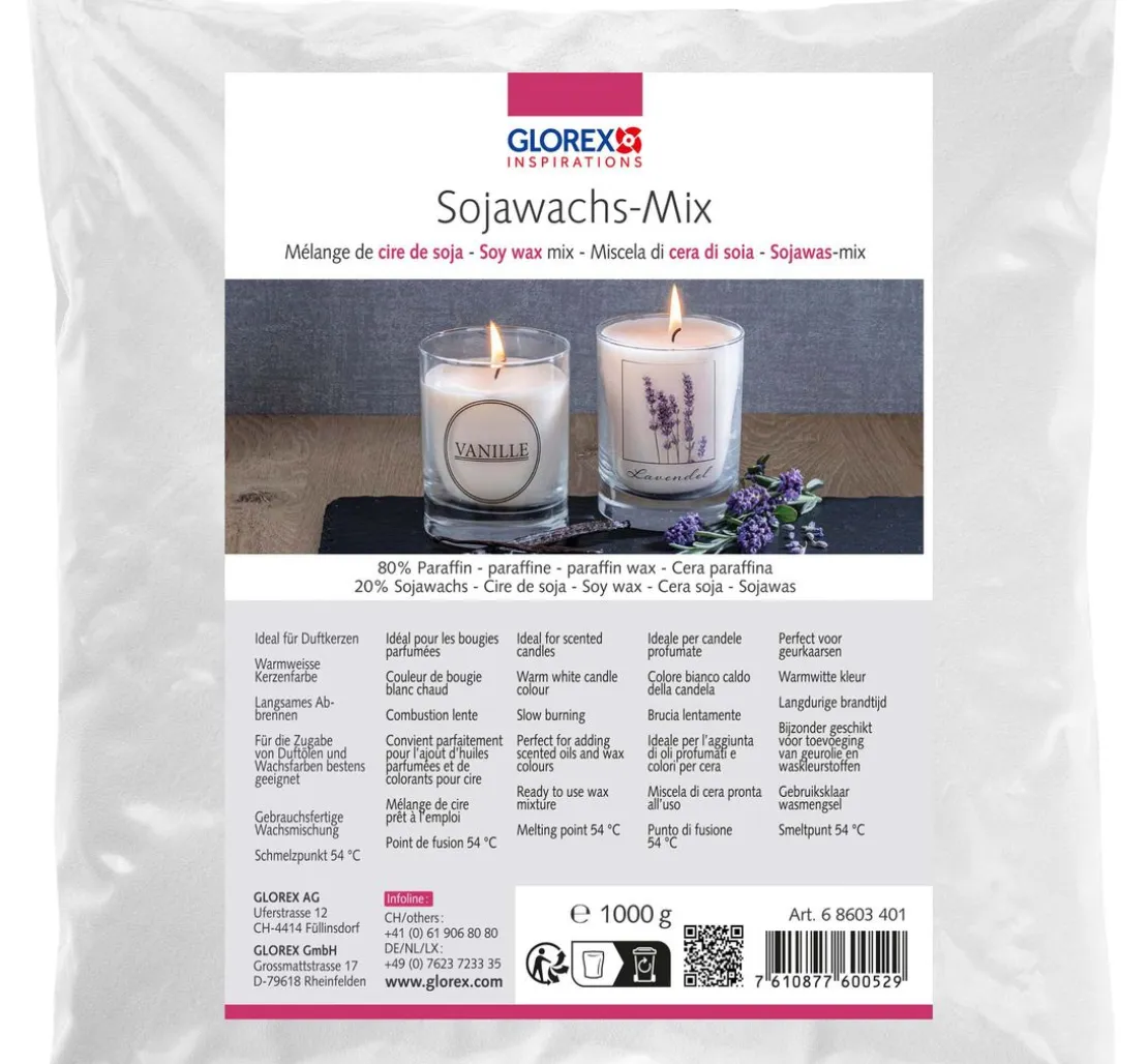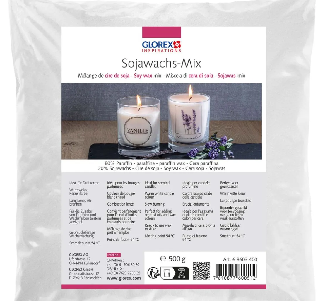 Das Sojawachs besticht durch seine vielseitigen Eigenschaften: Es eignet sich hervorragend für die Zugabe von Duftölen und Wachsfarben, sodass du individuelle Kreationen gestalten kannst. Mit einem Schmelzpunkt von 54 °C lässt sich das Wachs leicht verarbeiten und sorgt für ein langsames, gleichmäßiges Abbrennen deiner Kerzen.
