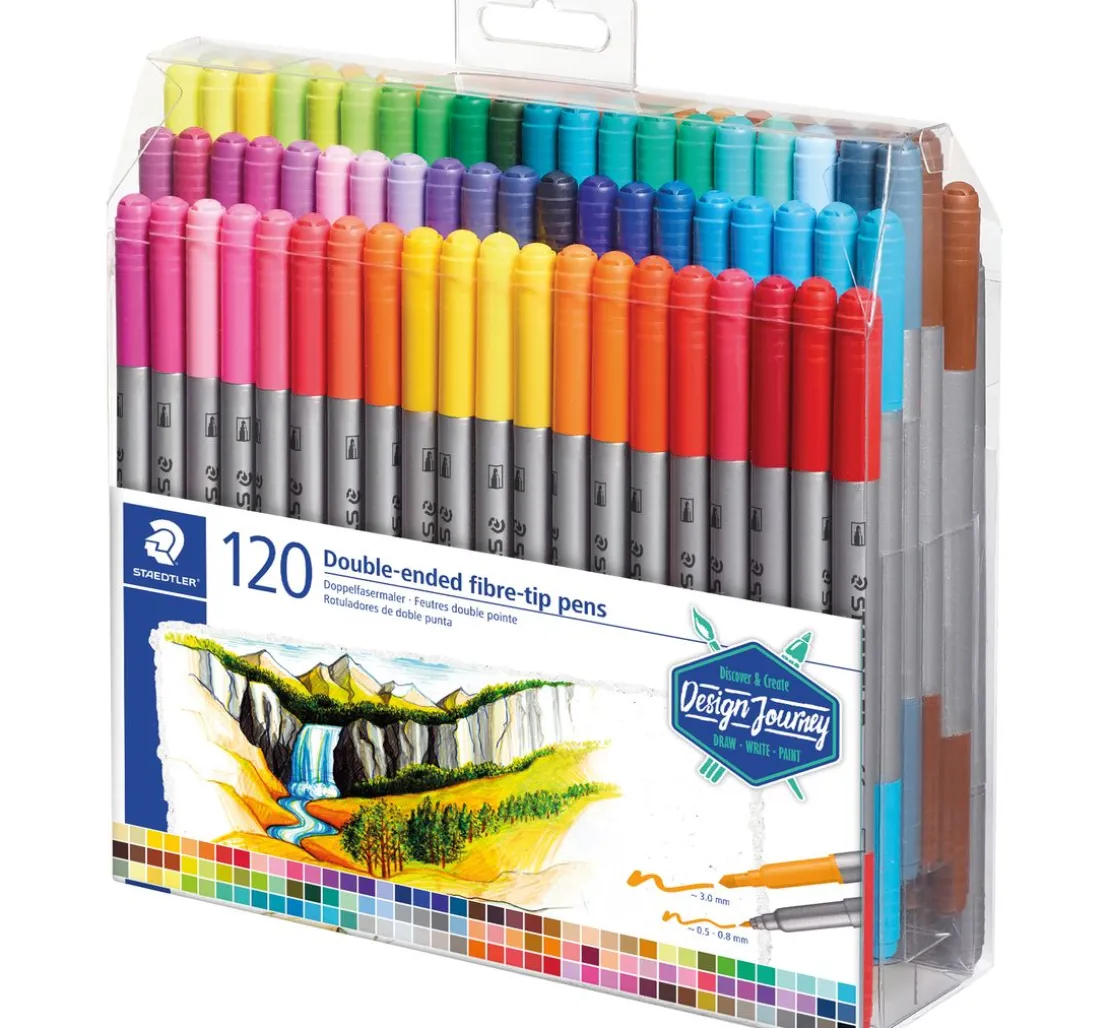 Eine riesige Auswahl an vielen Farbnuancen bieten die 120 Doppelfasermaler von STAEDTLER. Die Stifte sind ideal zum Zeichnen, Malen, Schreiben und Kolorieren. Die Strichstärke beträgt 3,0 mm und 0,5 – 0,8 mm. Die eindrucksichere Spitze lässt feine, schmale Linien und breite, kräftige Striche zu.