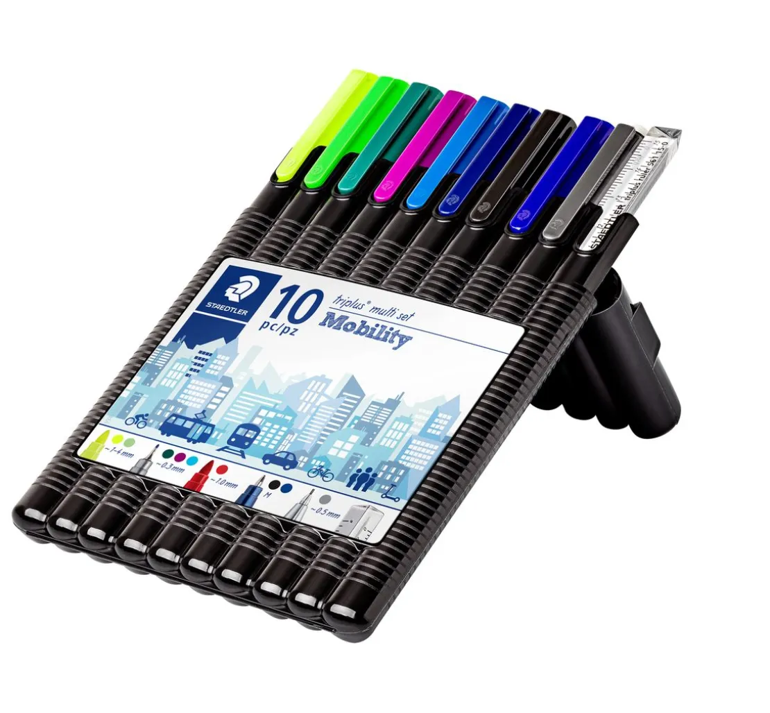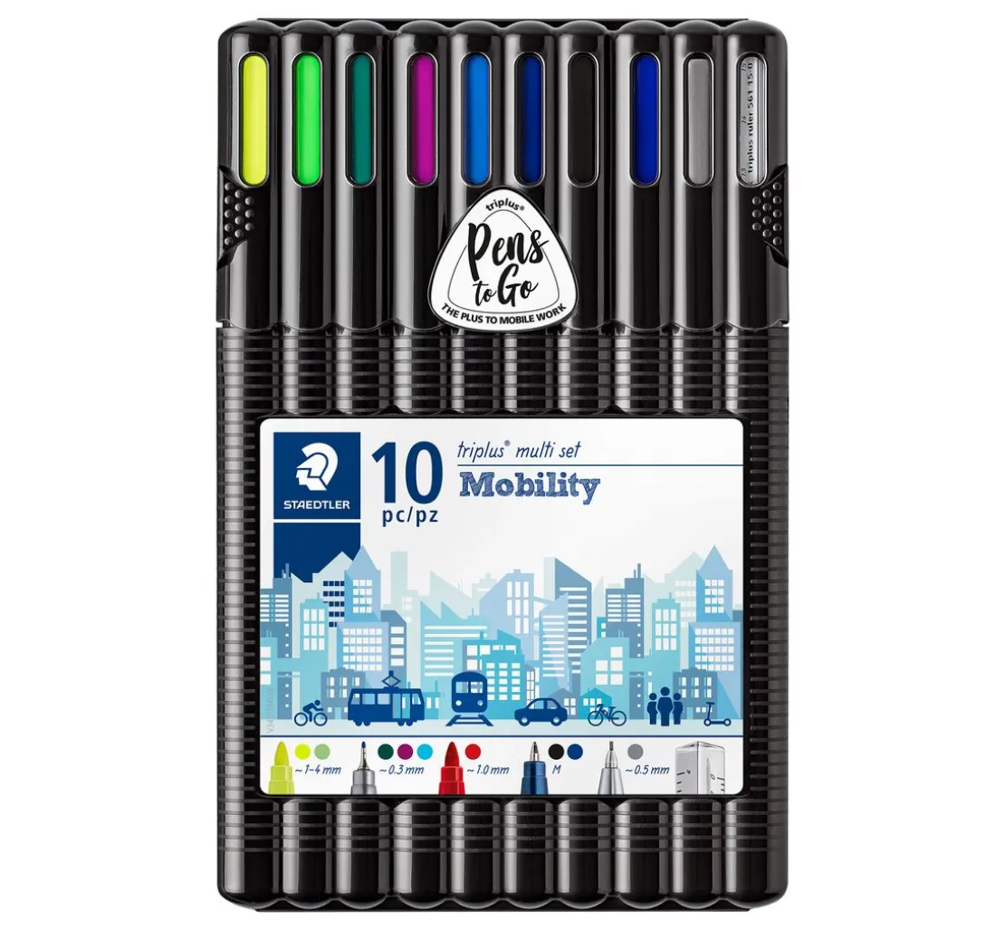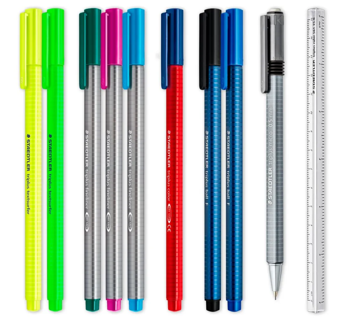 Das STAEDTLER Schreibset triplus „to go“ enthält eine Auswahl von 9 Stiften und einem Lineal mit einer Länge von 15 cm. Die Stifte der triplus Reihe mit Dreikantschaft sind ergonomisch geformt und liegen gut in der Hand.