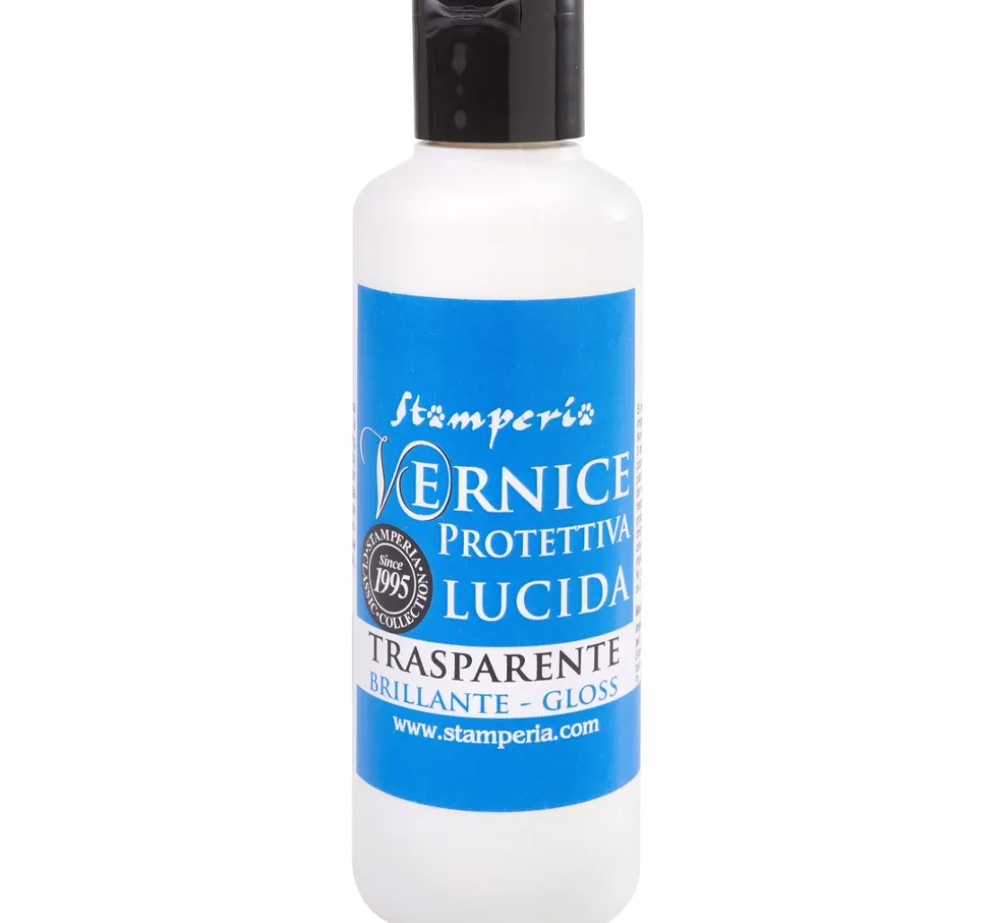 Stamperia „Varnish“ mit einem Inhalt von 80 ml. Ein gebrauchsfertiger Decklack für nahezu alle Oberflächen. Der transparente Lack ist ein Schutzlack für den Innen-Bereich. Er wird mit einem Pinsel aufgetragen. Nach dem Anstrich sollte der Lack gut durchtrocknen. Nutzen Sie diesen Lack beispielsweise für Scrapbook-Projekte, Mixed-Media, Tabletts, Terrakotta-Töpfe und vieles mehr.