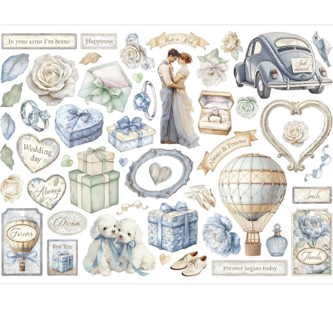Tauche ein in die Vielfalt von Blumen, Blütenblättern, einem verliebten Paar, Heißluftballon, Auto, Geschenken, Ringen, Tags und mehr. Diese aus Papier gefertigten Motive sind perfekt für Scrapbookarbeiten, Grußkarten, Geschenkverpackungen und das Verzieren von Schachteln und Papiertüten geeignet.