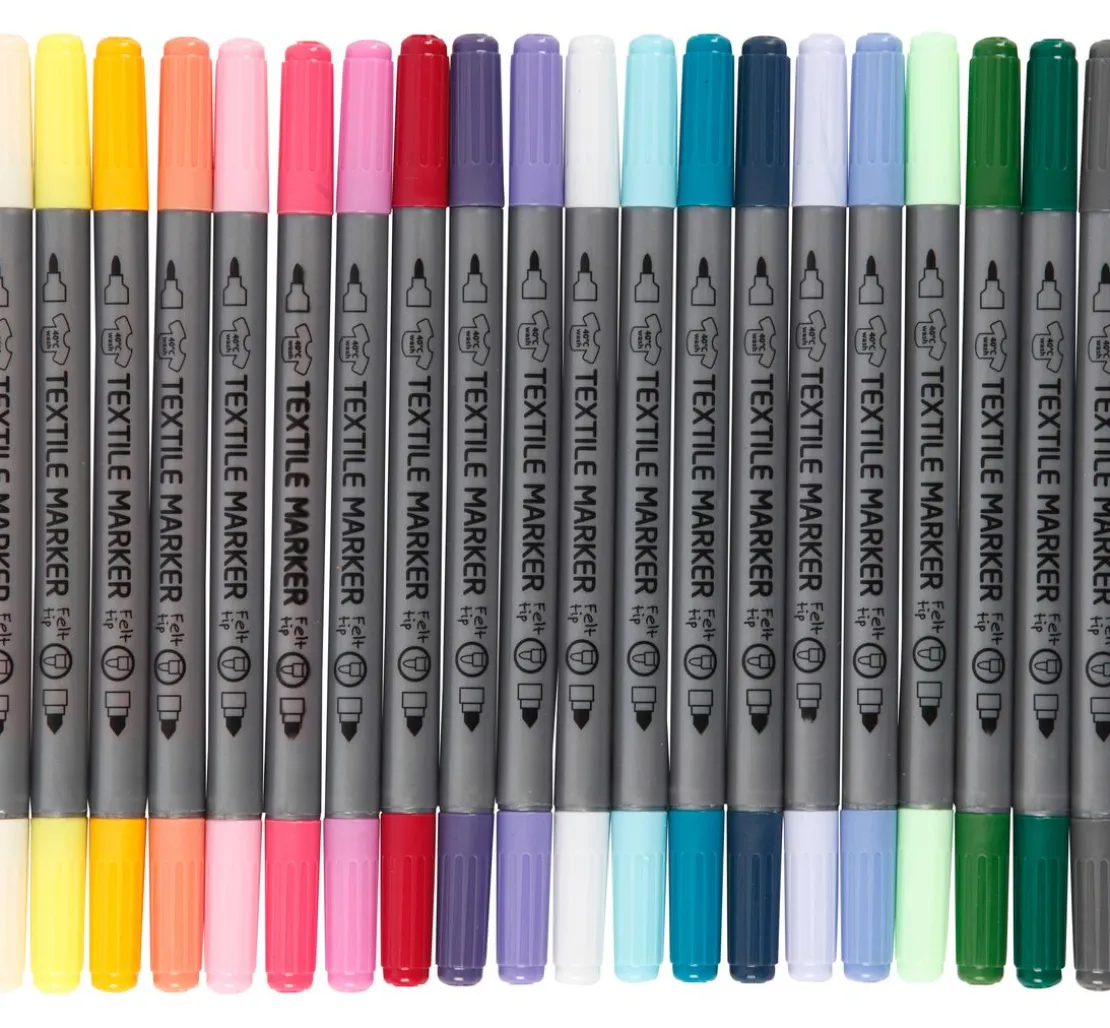 Mit 20 leuchtenden Farben, die auf Natur- und Synthetiktextilien anwendbar sind, bist du bereit, deinen Ideen Gestalt zu geben. Das Dual-Spitzen-Design bietet dir volle Flexibilität: eine feine Spitze für detailreiche Designs und eine breite Spitze für mutige Linien. Die Tinte bleibt auch nach dem Waschen bis zu 40 °C farbintensiv, und macht deine Kreationen dauerhaft und waschbeständig.