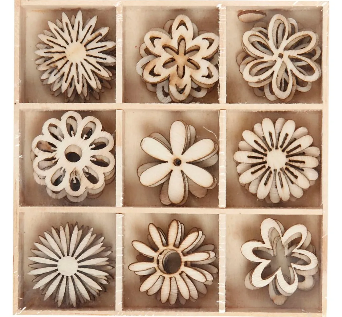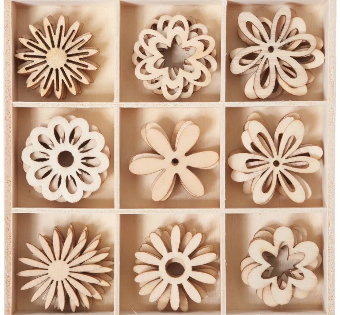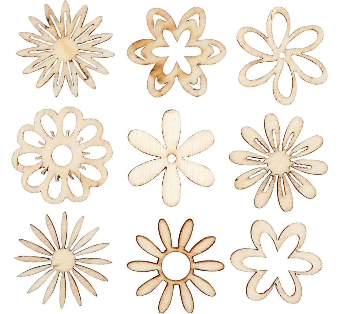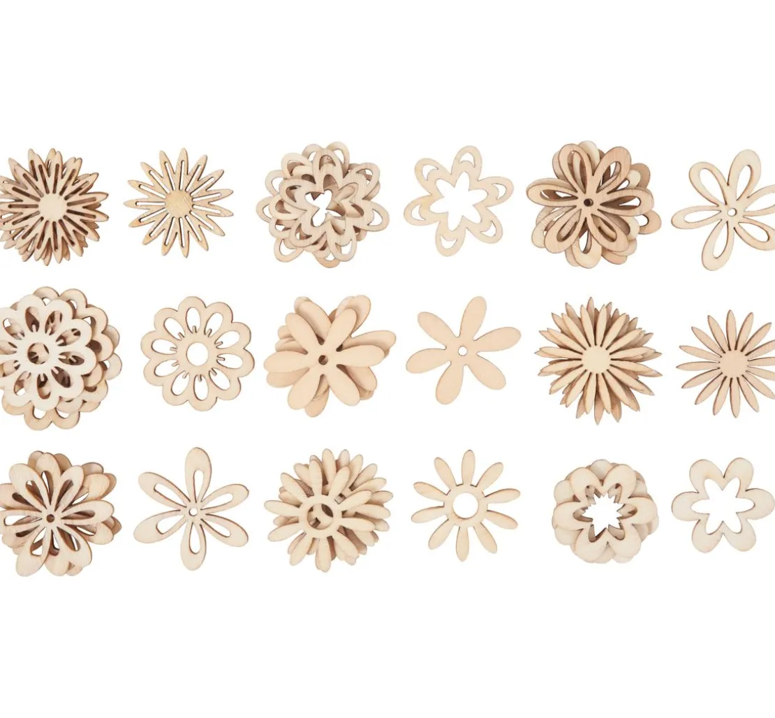 Die frühlingshaften Streuteile Blüten Mix „Shari“ haben einen Ø von ca. 2,8 cm mit einer Stärke von ca. 1 – 2 mm und bestehen aus Holz. Es sind 45 gelaserte Blumen in 9 verschiedenen Motiven enthalten.