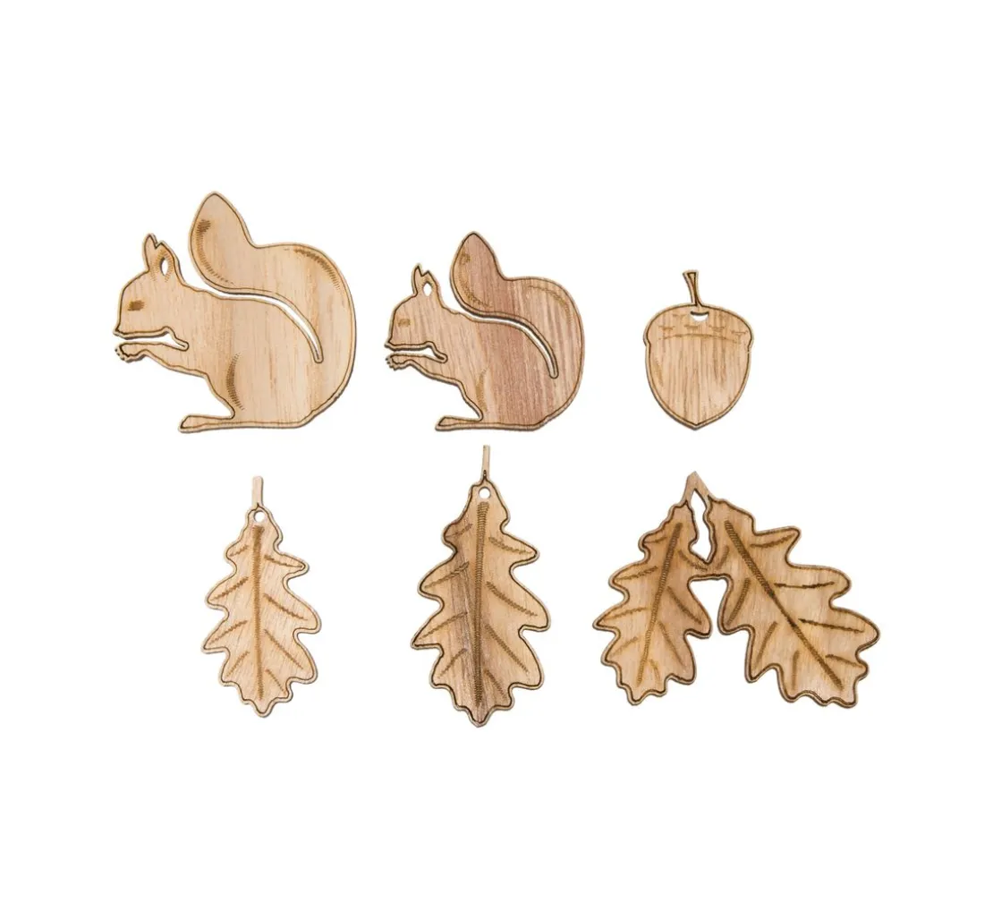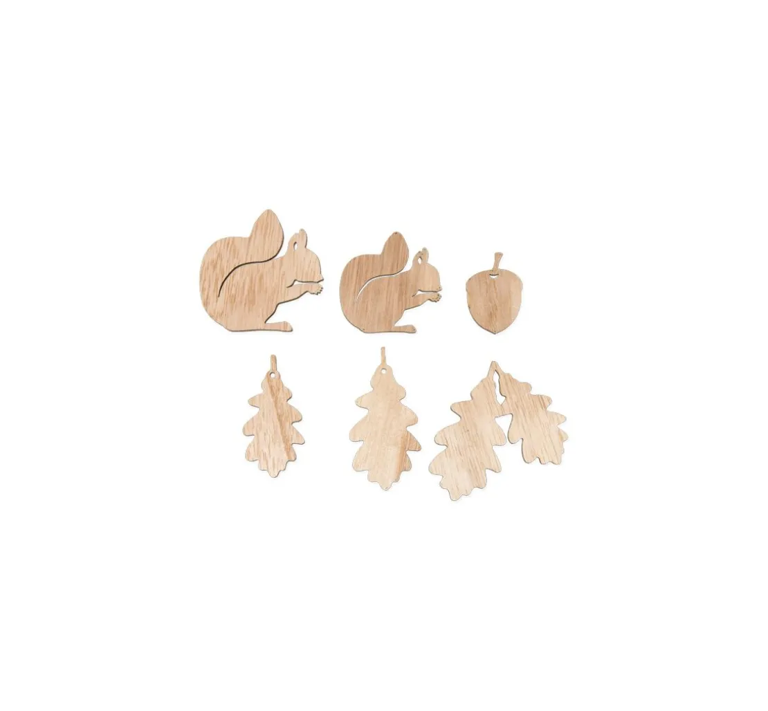 Diese wunderschönen Streuteile „Eichhörnchen und Eichelblätter“, 6er-Set haben eine Größe von ca. 4,0 bis 7,0 cm mit einer Holzstärke von ca. 3 mm. Das Set enthält 2 Eichhörnchen ca. 5,0 bis 6,0 cm, 3 Eichenblätter ca. 6,0 bis 7,0 cm und eine Eichel ca. 4,0 cm. Das Design ist made in Germany.