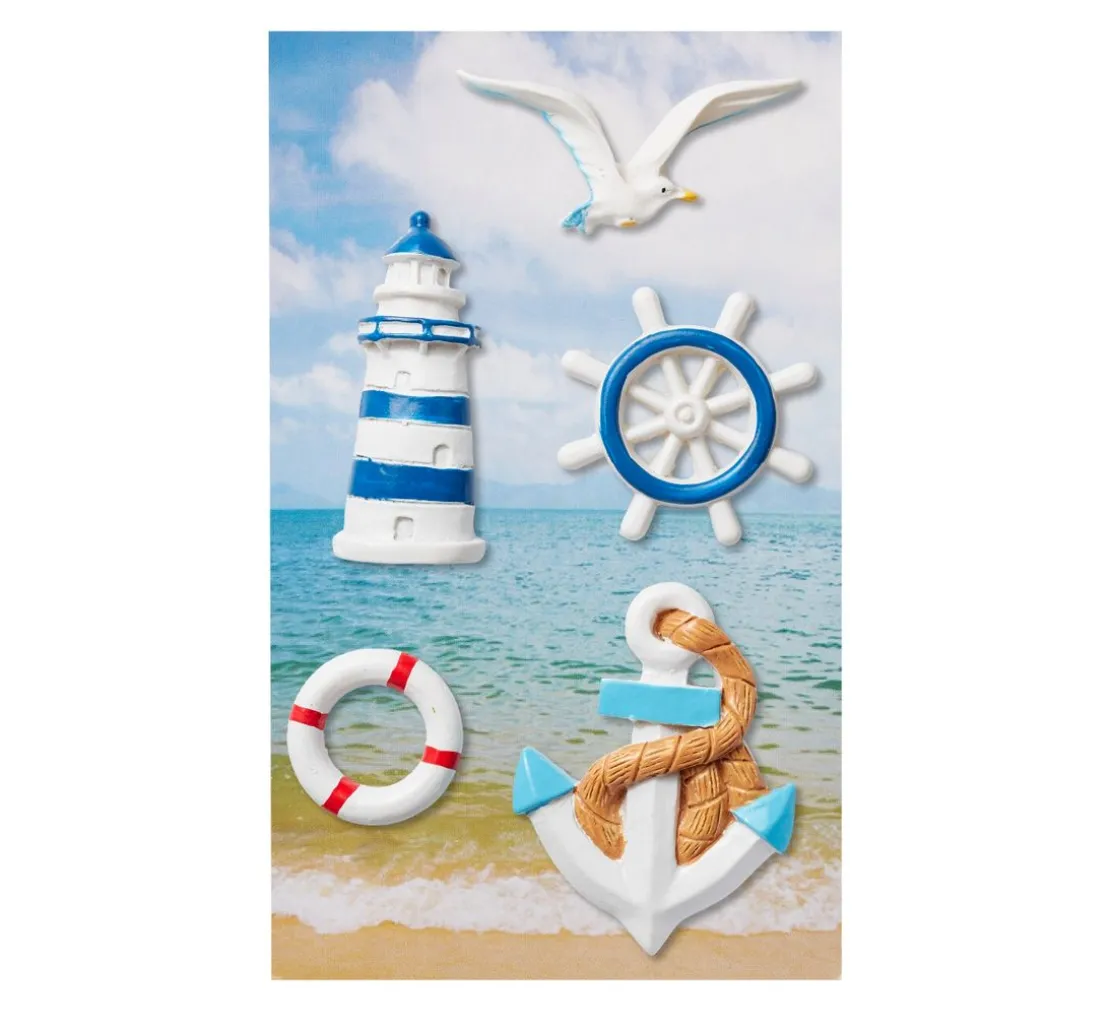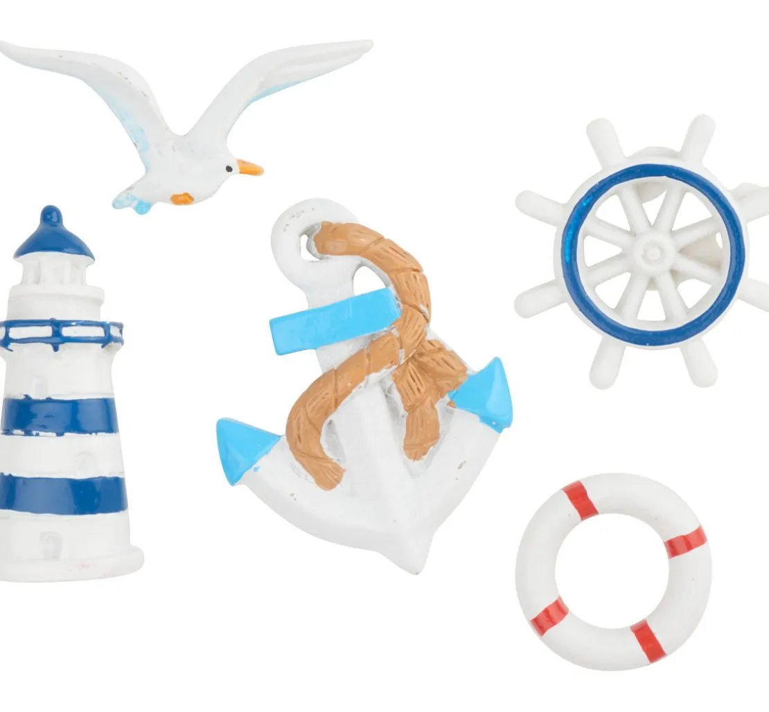 Wunderschöne Streuteile Maritim „Sellin“ aus Polyresin im 5er-Set. Die maritimen Motive wie Möwe, Leuchtturm, Steuerrad, Rettungsring und Anker haben eine Größe von ca. 2,5 x 2,5 cm bis 5,3 x 4,0 cm.