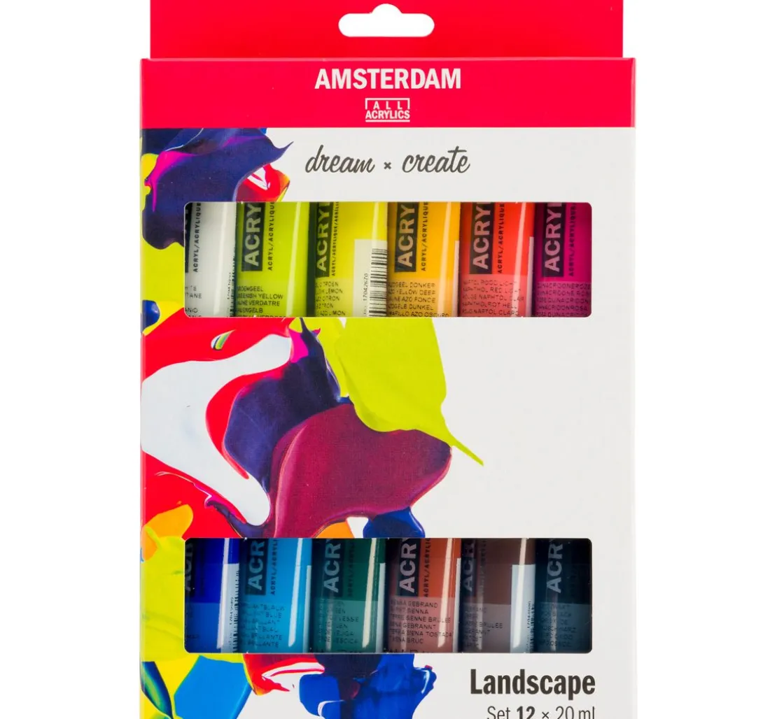 Für Landschaftskunstwerke beinhaltet das Talens AMSTERDAM Acrylfarben-Set „Landschaft“ 12 perfekt aufeinander abgestimmte Farbtöne mit einer Füllmenge von jeweils 20 ml. Die Farben weisen eine mittlere Viskosität auf und bestehen aus hochwertigen Pigmenten und einer 100%igen Acrylemulsion. Kräftige, schöne Pinselstriche und Texturen werden erreicht.
