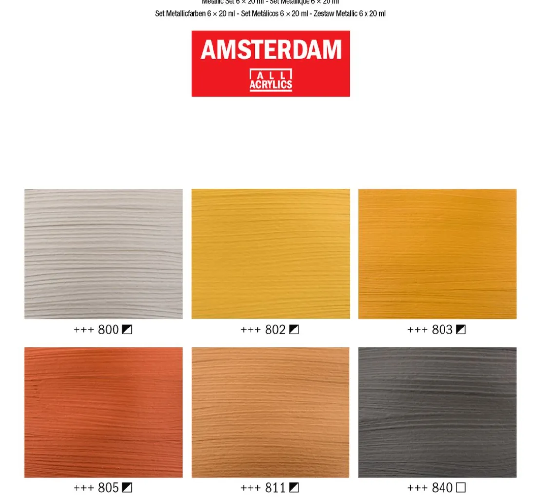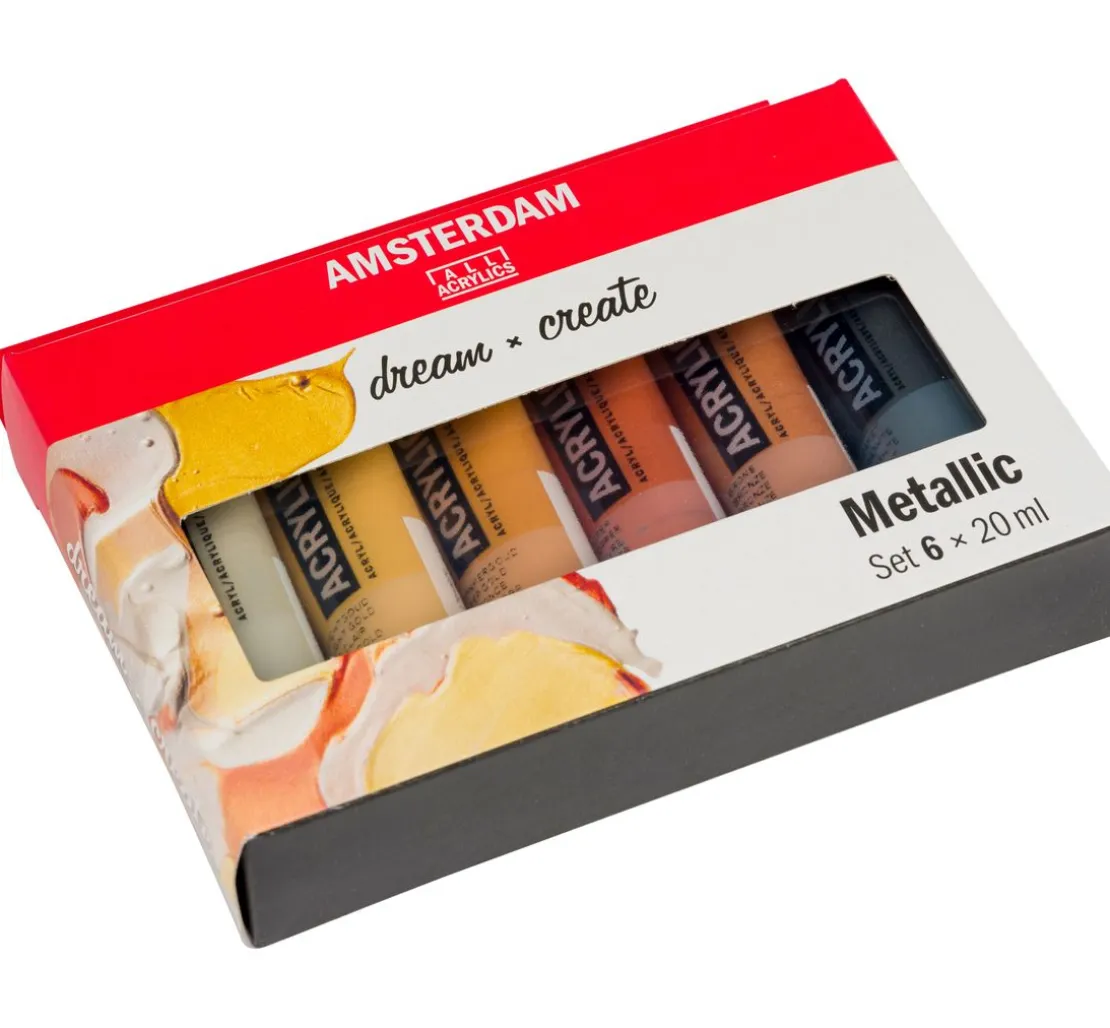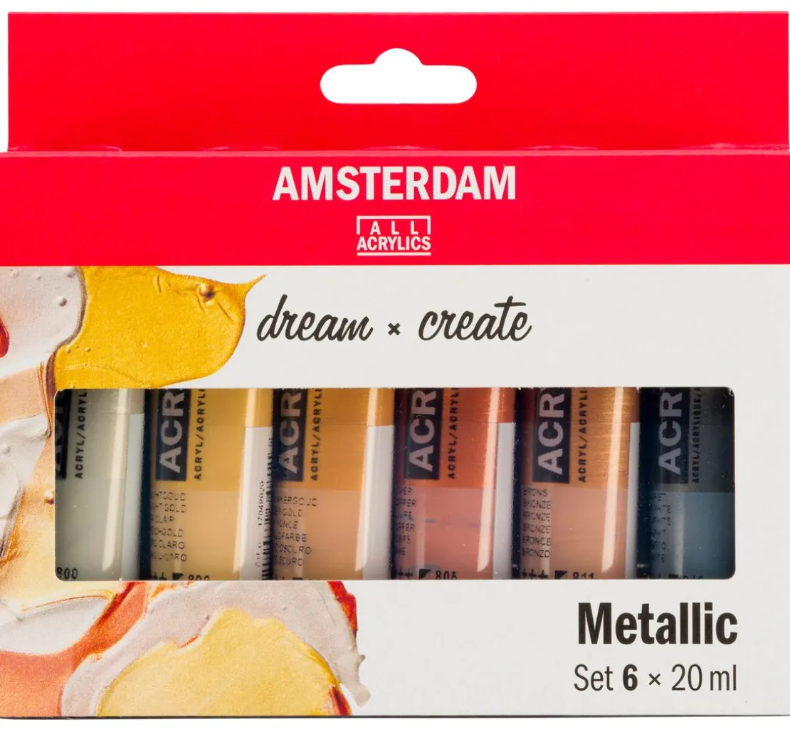 Das Talens AMSTERDAM Acrylfarben-Set „Metallic“ enthält 6 Farben mit einer Füllmenge von jeweils 20 ml. Die metallischen Farben haben verschiedene Deckungsgrade. Die brillanten Farbtöne lassen sich mit Wasser verdünnen.