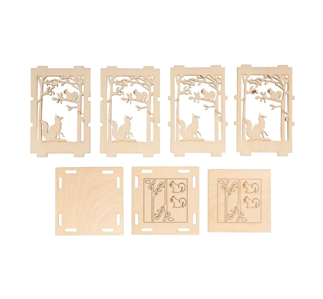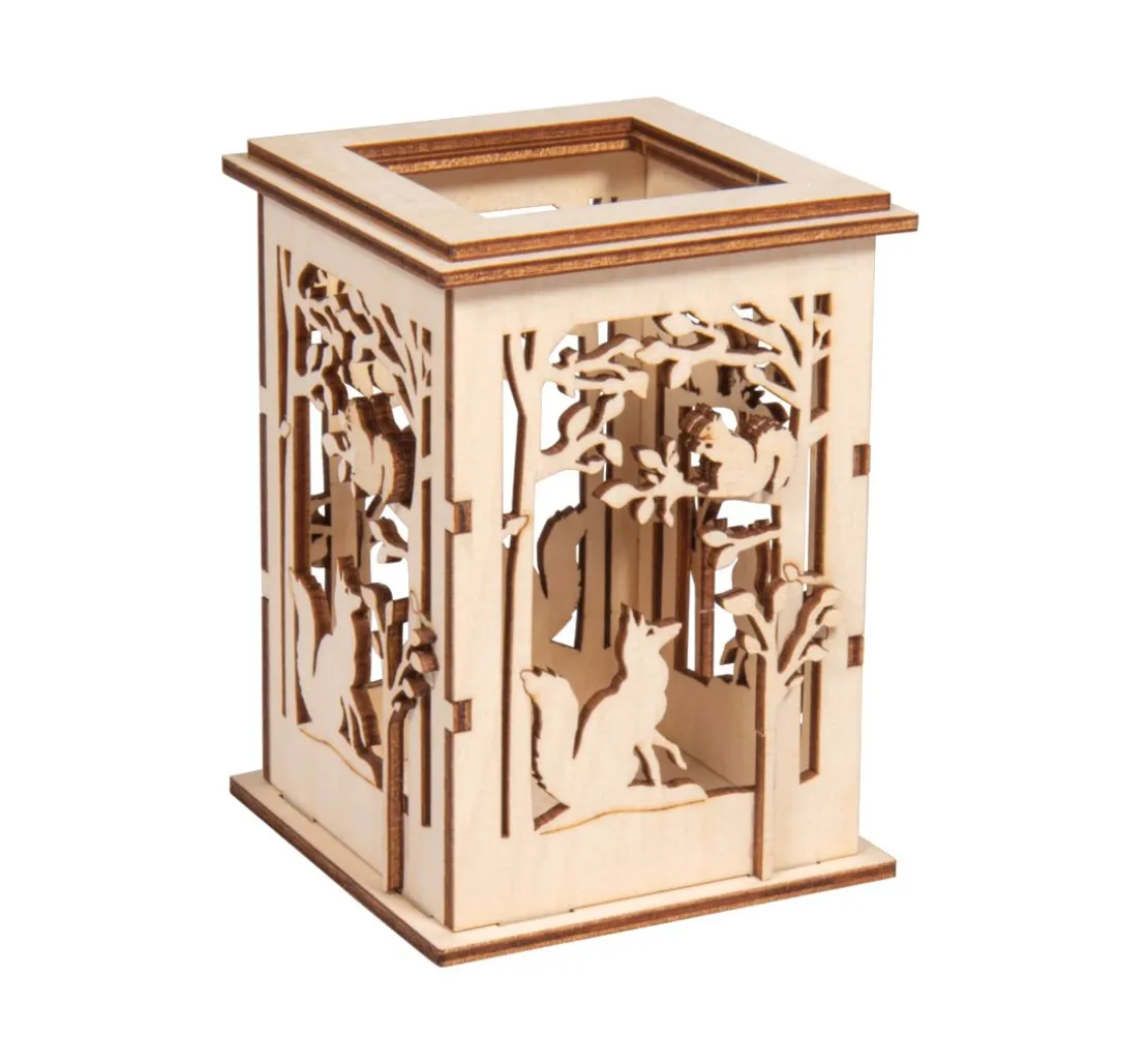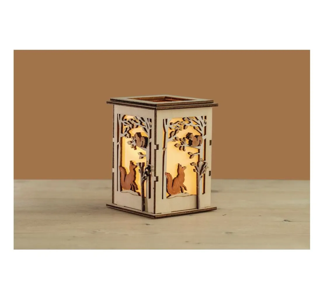 Mit unserer Tischlaterne „Wald“ kannst du in deinem Zuhause ganz einfach in eine gemütliche Atmosphäre zaubern. Der Bausatz besteht aus 15 Teilen, die du ganz einfach zusammenstecken und mit Kleber (nicht enthalten) fixieren kannst. Die Laterne hat eine Größe von ca. 8,5 x 8,5 x 11,7 cm und ist aus Sperrholz gefertigt. Sie ist unbemalt und kann somit ganz nach deinen Wünschen gestaltet werden.