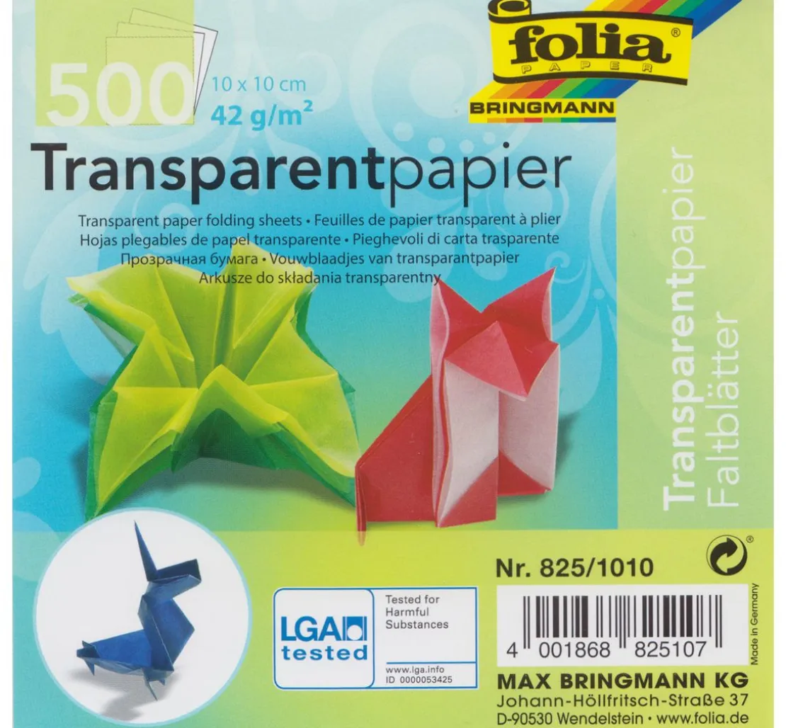 Die Transparentpapier-Faltblätter „10 x 10 cm“ werden in der vorteilhaften XXL Packung mit 500 Blatt geliefert. Das durchgefärbte Papier ist in 10 verschiedenen Farben enthalten. Papiergewicht ca. 42 g/m².