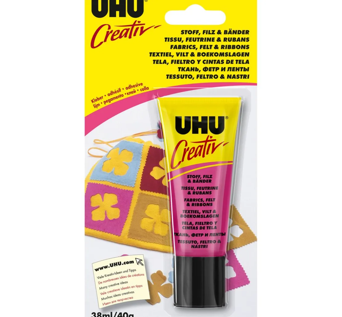 Der UHU Creativ klebt viele Stoffe, besonders geeignet für Baumwolle, Leinen, Jeans, Jute, Wolle, Watte u.v.a. Um Wasch- und Reinigungsbeständigkeit zu erreichen, muss die Klebestelle überbügelt werden. Trocknet farblos auf. Außerdem für Filz, Bänder, Wolle, Watte, Pompons, Pfeifenputzer, Kordeln geeignet. Gestalten Sie Puppen, Marionetten, Stofftiere, Kleidung, Taschen, Seidenblumen, Grußkarten, Bucheinbände, Tisch- und Raumschmuck uvm. Ohne Lösungsmittel. Inhalt: 40 g.