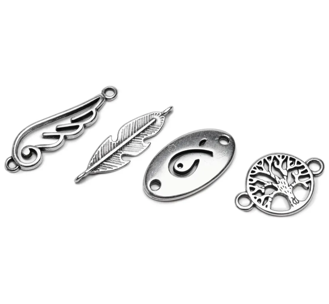 Wunderschöner VBS Anhänger-Mix aus Metall zum Anfertigen von individuellen Armbändern. Das 4-teilige Anhänger-Set besteht aus unterschiedlichen Motiven, wie Feder, Flügel, Baum oder einem Fisch.