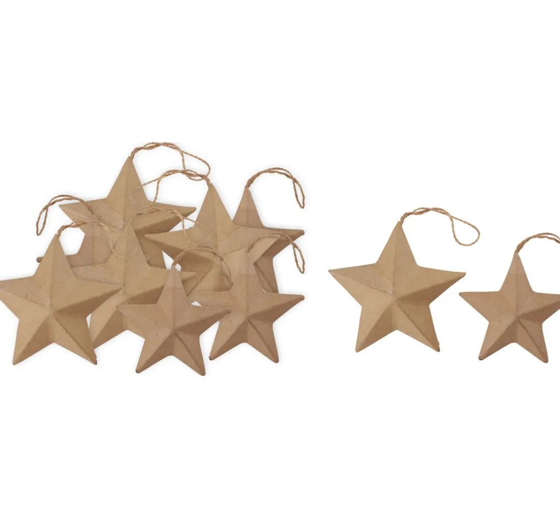 VBS Anhänger Pappsterne als 10er Set mit einer Größe von ca. Ø 7,8 cm und 9,7 cm. Je Größe erhalten Sie 5 Sterne. Perfekt geeignet für Bastelarbeiten in der Weihnachtszeit. Oben am Stern ist ein kleines Anhängebändchen aus Jute angebracht.