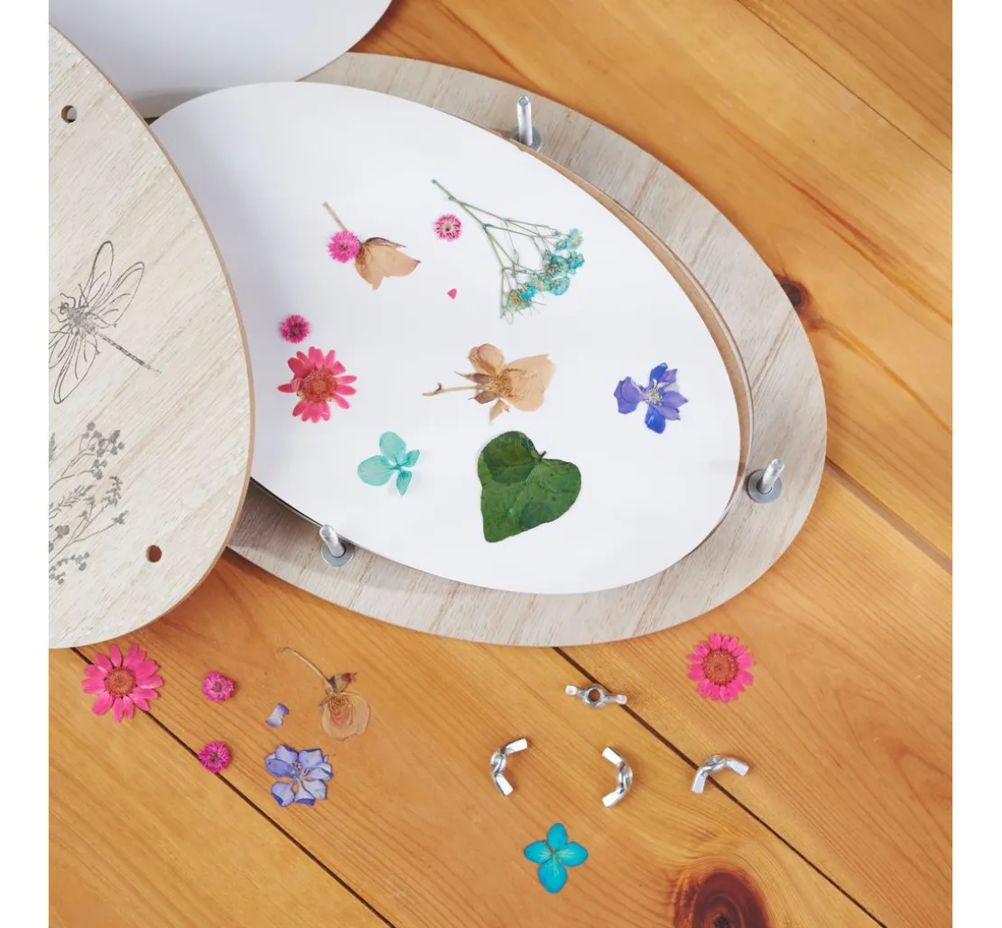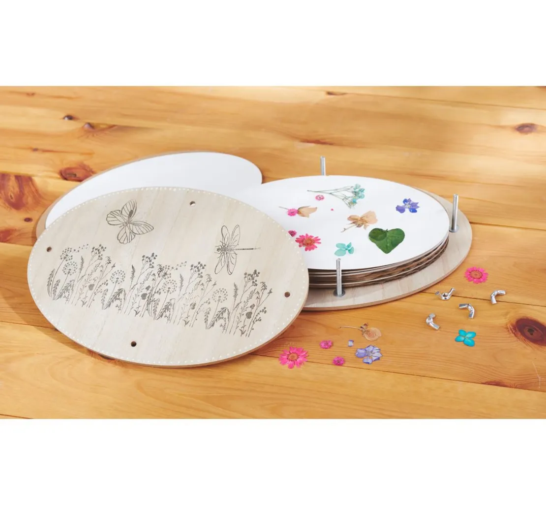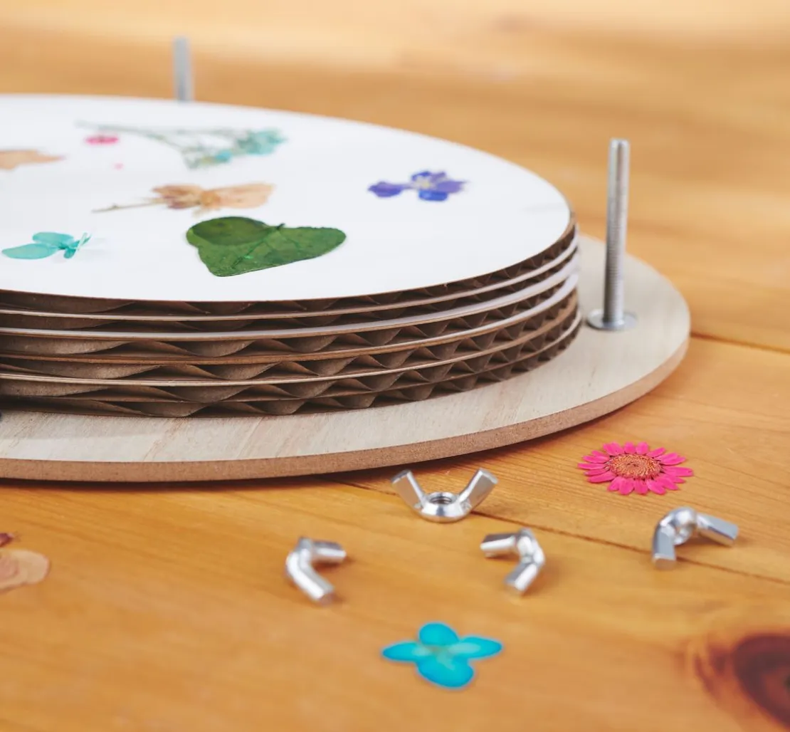 Die Blumenpresse hat eine ovale Form und besteht aus 2 Holzplatten, 7 festen Kartonplatten, 12 weißen dünnen Pappen und 4 Schrauben. Die oberste Holzplatte kann nach Belieben mit Brandmalerei, Décopatch-Papieren, Serviettentechnik oder mit ersten selbstgepressten Blumen oder Blättern wundervoll gestaltet werden.