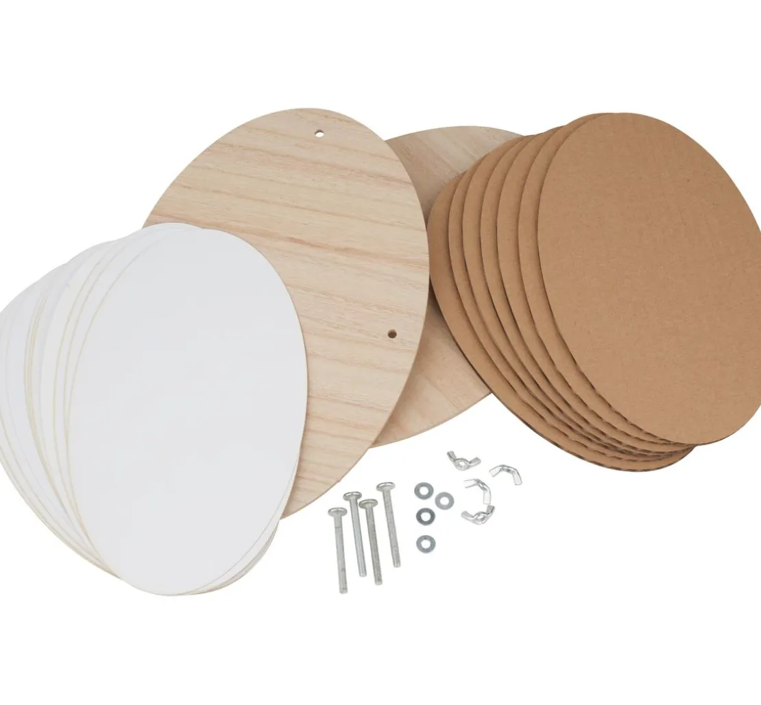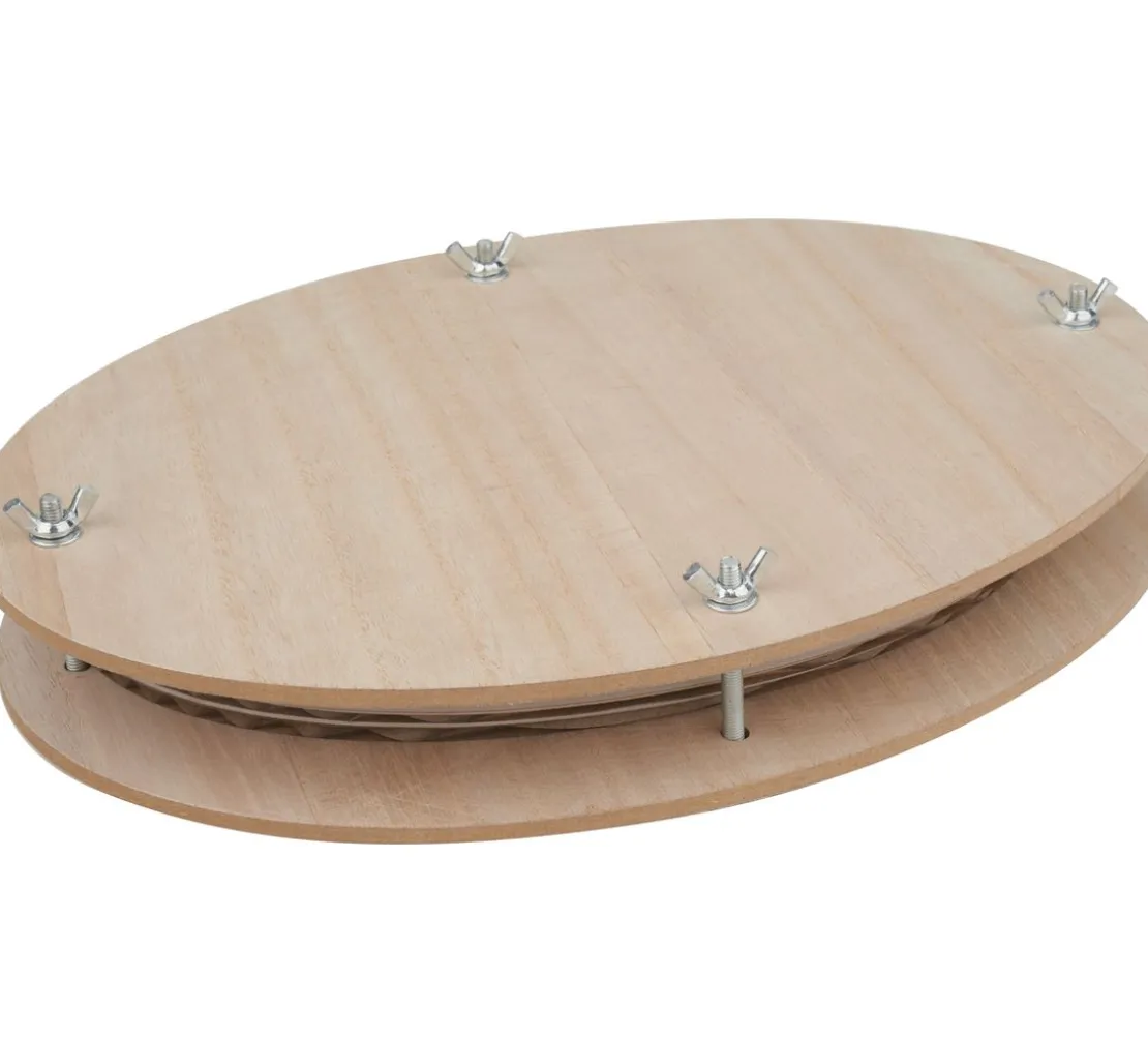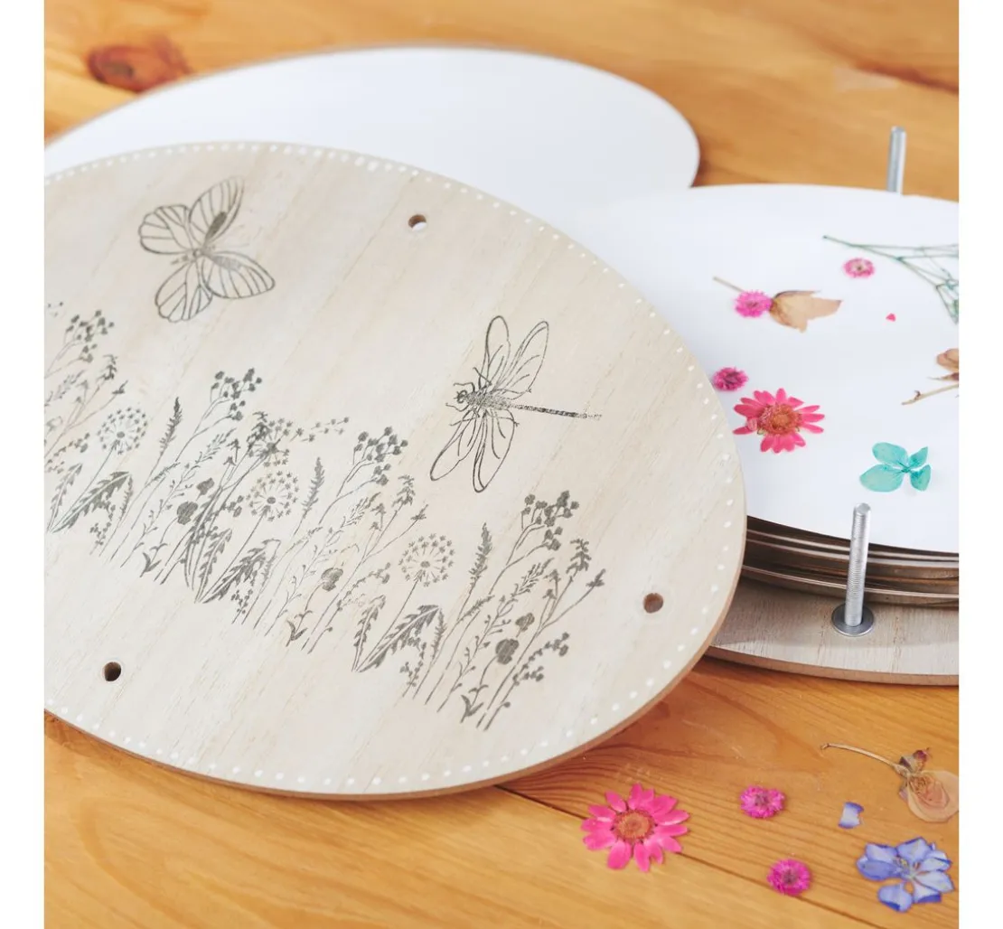 Die Blumenpresse hat eine ovale Form und besteht aus 2 Holzplatten, 7 festen Kartonplatten, 12 weißen dünnen Pappen und 4 Schrauben. Die oberste Holzplatte kann nach Belieben mit Brandmalerei, Décopatch-Papieren, Serviettentechnik oder mit ersten selbstgepressten Blumen oder Blättern wundervoll gestaltet werden.