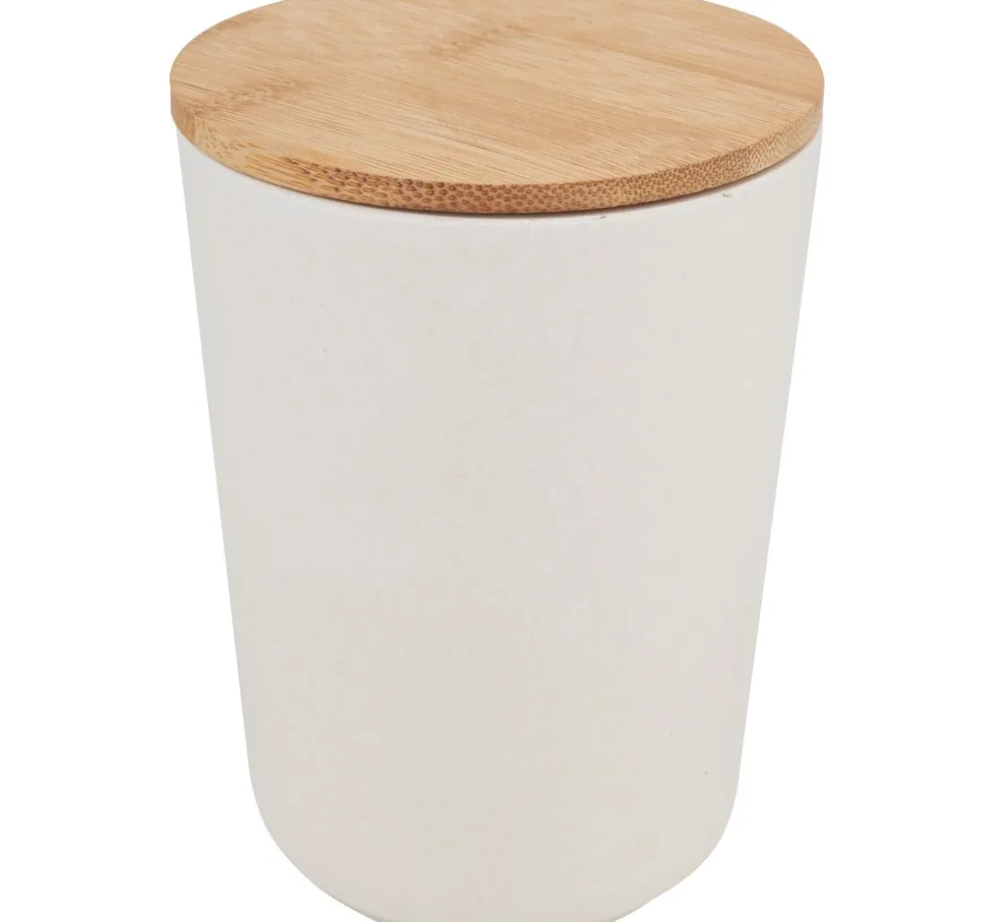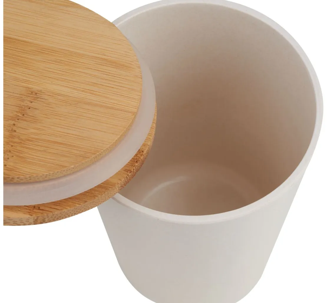 Schicke VBS Deko-Aufbewahrungsdose mit Deckel, rund und einer Höhe von ca. 14 cm. Die Vorratsdose hat oben einen Ø von ca. 10,3 cm und unten von ca. 8,0 cm. Der Deckel verfügt über einen Kunststoff-Ring, so kann die Vorratsdose luftdicht verschlossen werden. Das Material besteht aus 65 % Bambusfaser, 15 % Maispulver und 20 % Melamin. Melamin ist für den Zusammenhalt der Bambus Vorratsdose notwendig und macht sie robust und mehrwegfähig.