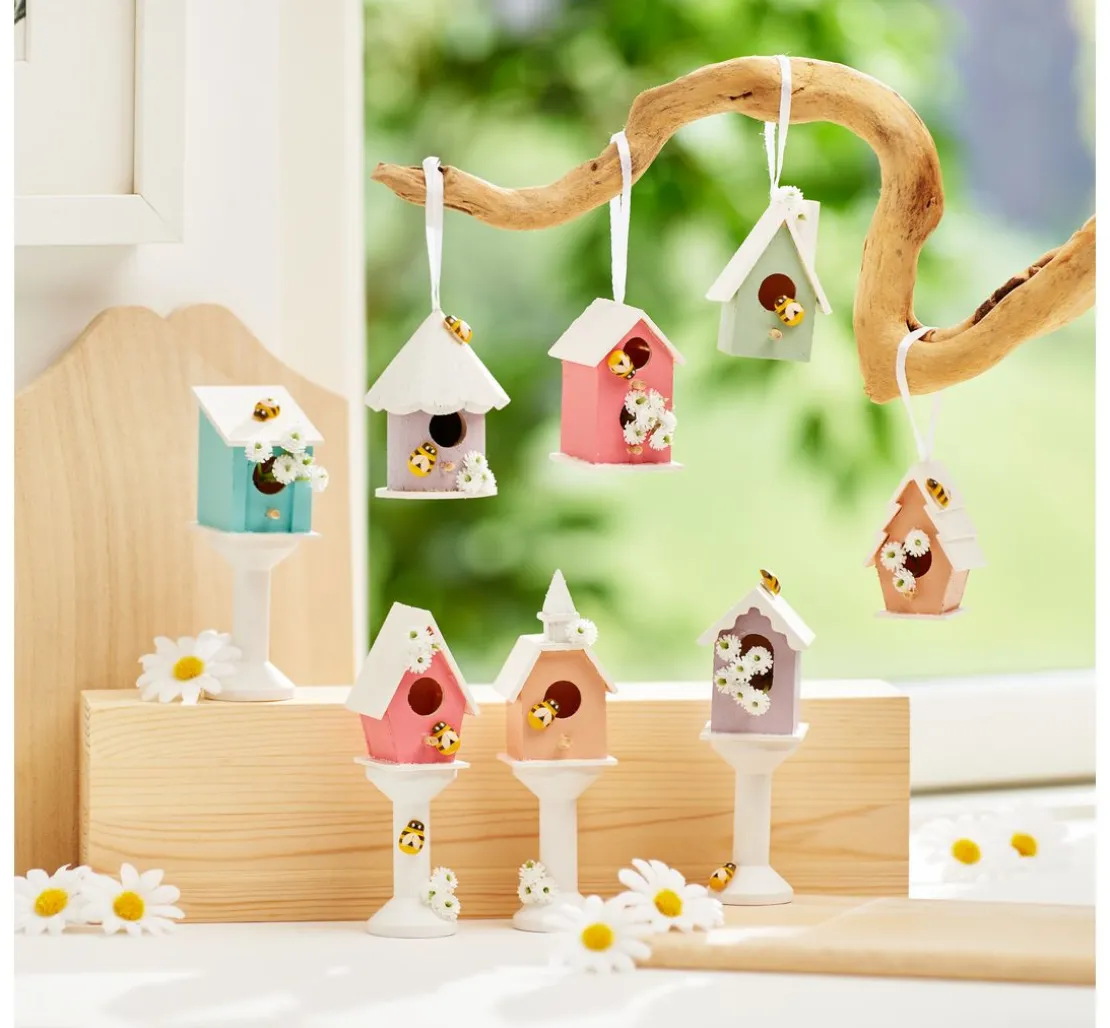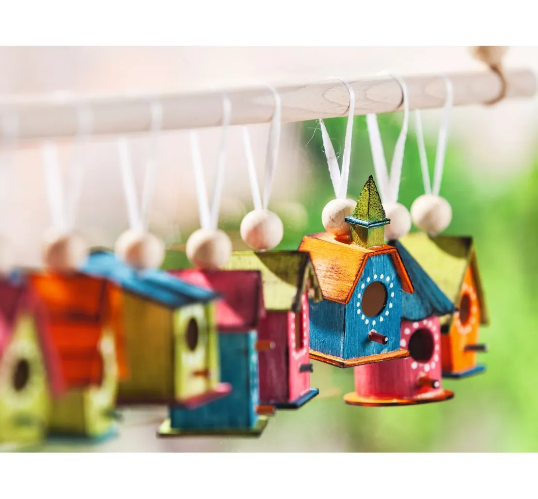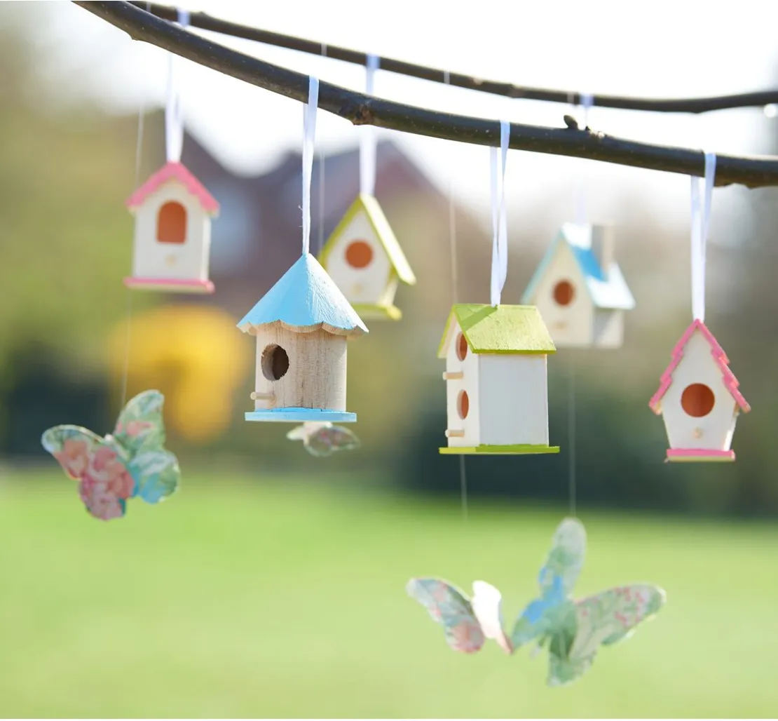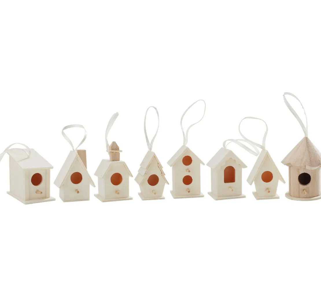 Tolles Set bestehend aus 8 verschiedenen Vogelhäusern. Die Vogelhäuser bestehen aus Rohholz. Niedliche Vogelhäuschen für viele kreative Ideen. Die Vogelhäuser eignen sich zum Stellen und Aufhängen. Inkl. Aufhängeband aus weißem Satin.