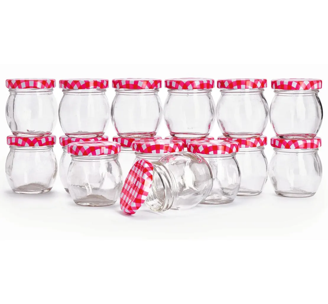 VBS XXL Gläser mit Schraubdeckel „Bauchig“, 16 Stück, aus Klarglas mit dekorativ kariertem Metall-Deckel in einer praktischen und supergünstigen VBS Großpackung. Die Gläser haben einen Durchmesser von ca. 5,5 cm und sind ca. 6 cm hoch. Jedes Glas hat ein Fassungsvermögen von ca. 80 ml.