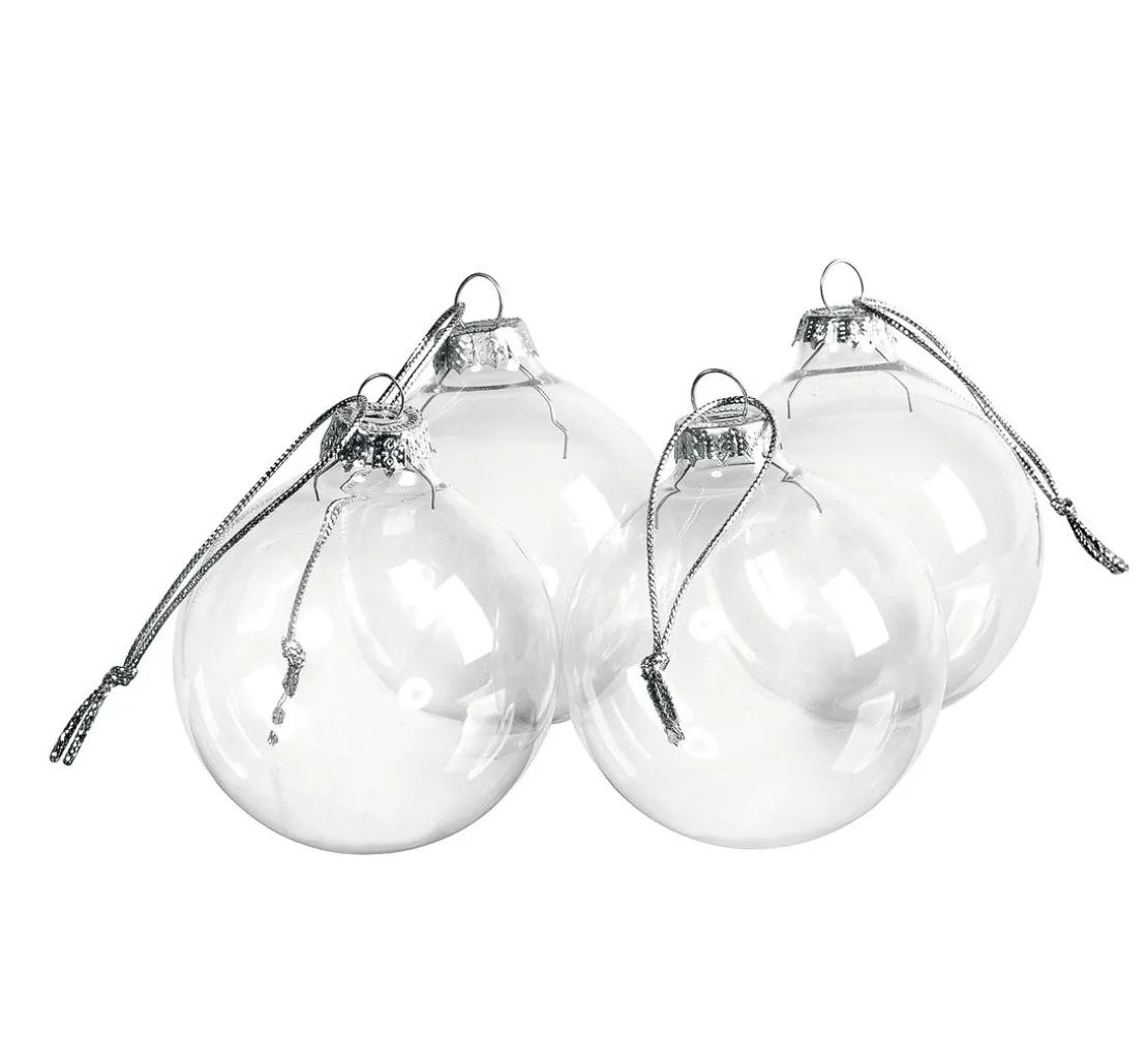 Vier tolle Glaskugeln aus Klarglas mit einer silberfarbenden Zierkappe mit Aufhängeöse und Aufhängeband.