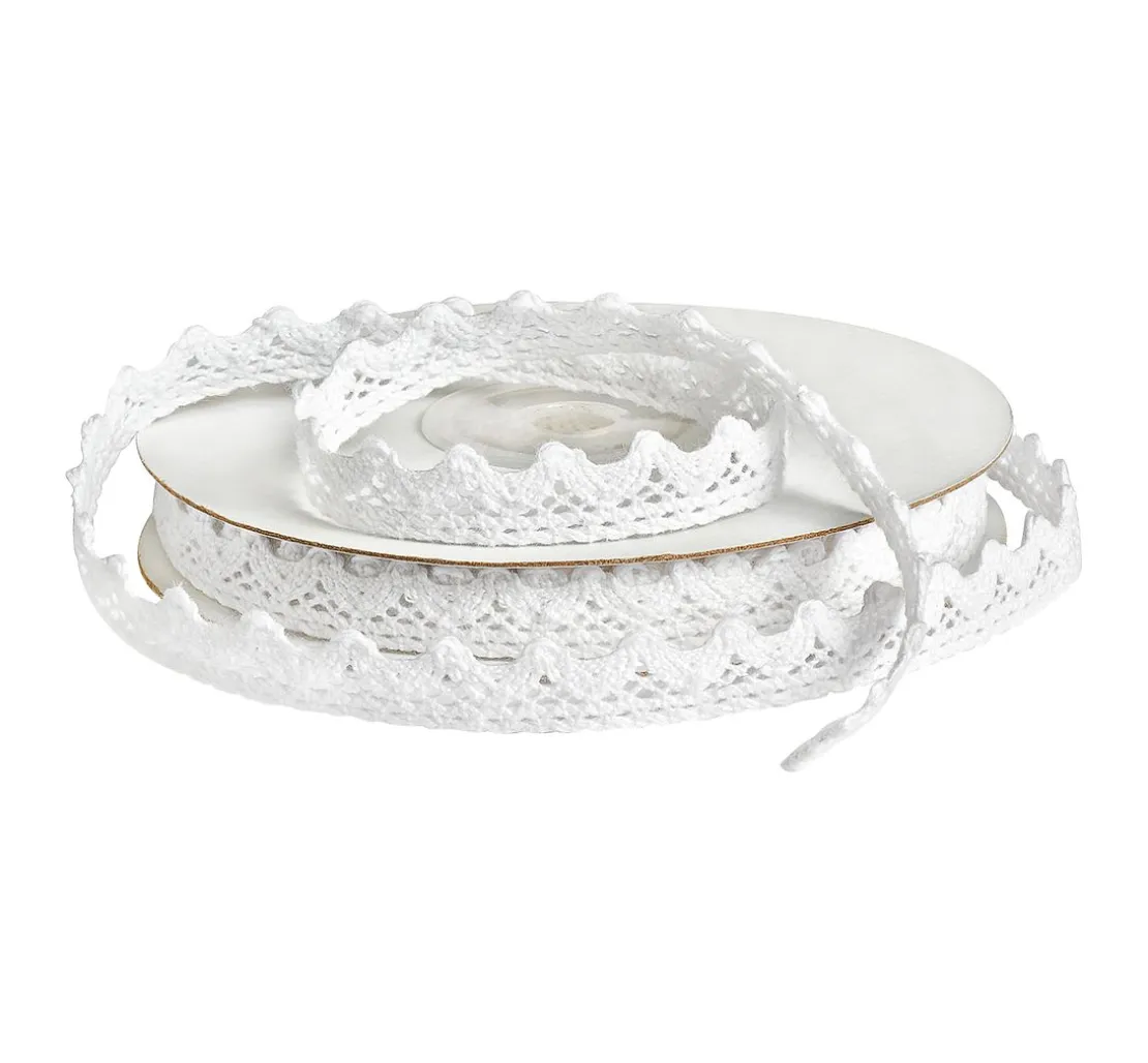 Das Baumwoll-Spitzenband mit den klassischen Mäusezähnchen ist ein wichtiges Accessoire beim Basteln und Handarbeiten. Die Zierlitze ist 10 mm breit, wird beispielsweise an Stoffkanten genäht, an Puppenstübchen geklebt oder für das Verzieren von Einmachgläsern in der kreativen Küche benutzt.