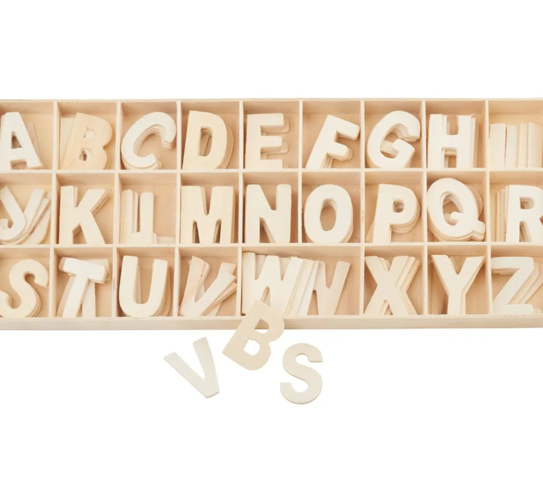 Holz-Buchstabensortiment mit 130 Teilen. In der praktischen Aufbewahrungsbox ist jeder Buchstabe fünf Mal enthalten.