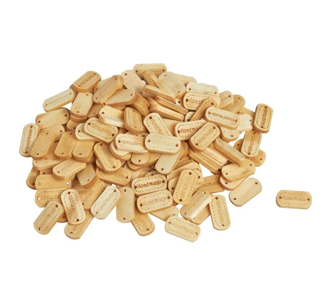 Die Holz-Label haben die Aufschrift „Handmade“, jeweils mit zwei kleinen Löchern zum Fixieren mit Nadel und Faden. Ideal für selbstgemachte Artikel, die Sie gerne als „Handmade“ auszeichnen möchten.