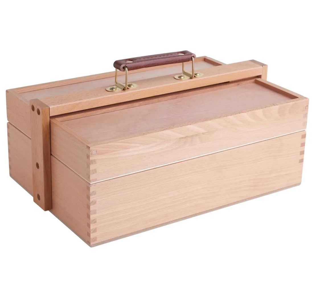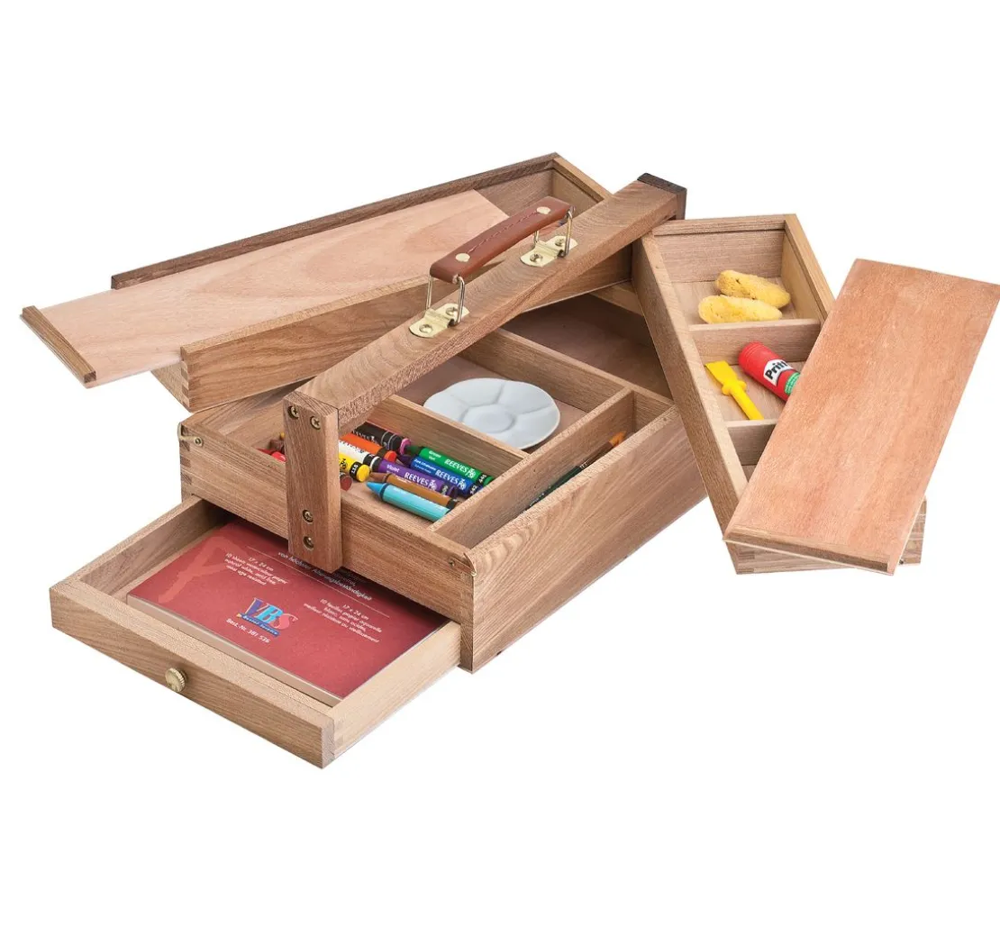 Entdecke die perfekte Lösung für deine kreative Ordnung! Mit dem VBS Holz-Utensilienkoffer hast du all deine Mal- und Bastelutensilien stets griffbereit. Der Koffer aus geöltem Buchenholz bietet dir auf drei Ebenen ausreichend Platz für Farbstifte, Paletten und DIN A4 Malgründe. Die oberste Ebene lässt sich zweiteilig zur Seite klappen und offenbart zusammen mit der mittleren Ebene acht unterschiedlich große Fächer. In der unteren Schublade findest du zusätzlichen Stauraum für deinen Künstlerbedarf. Der elegante Ledergriff sorgt für einen stilvollen Transport.