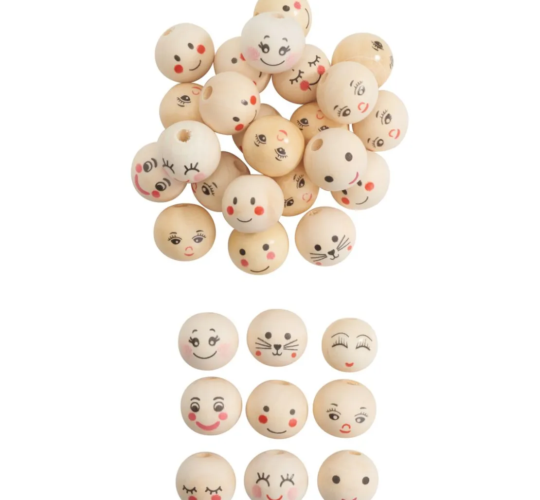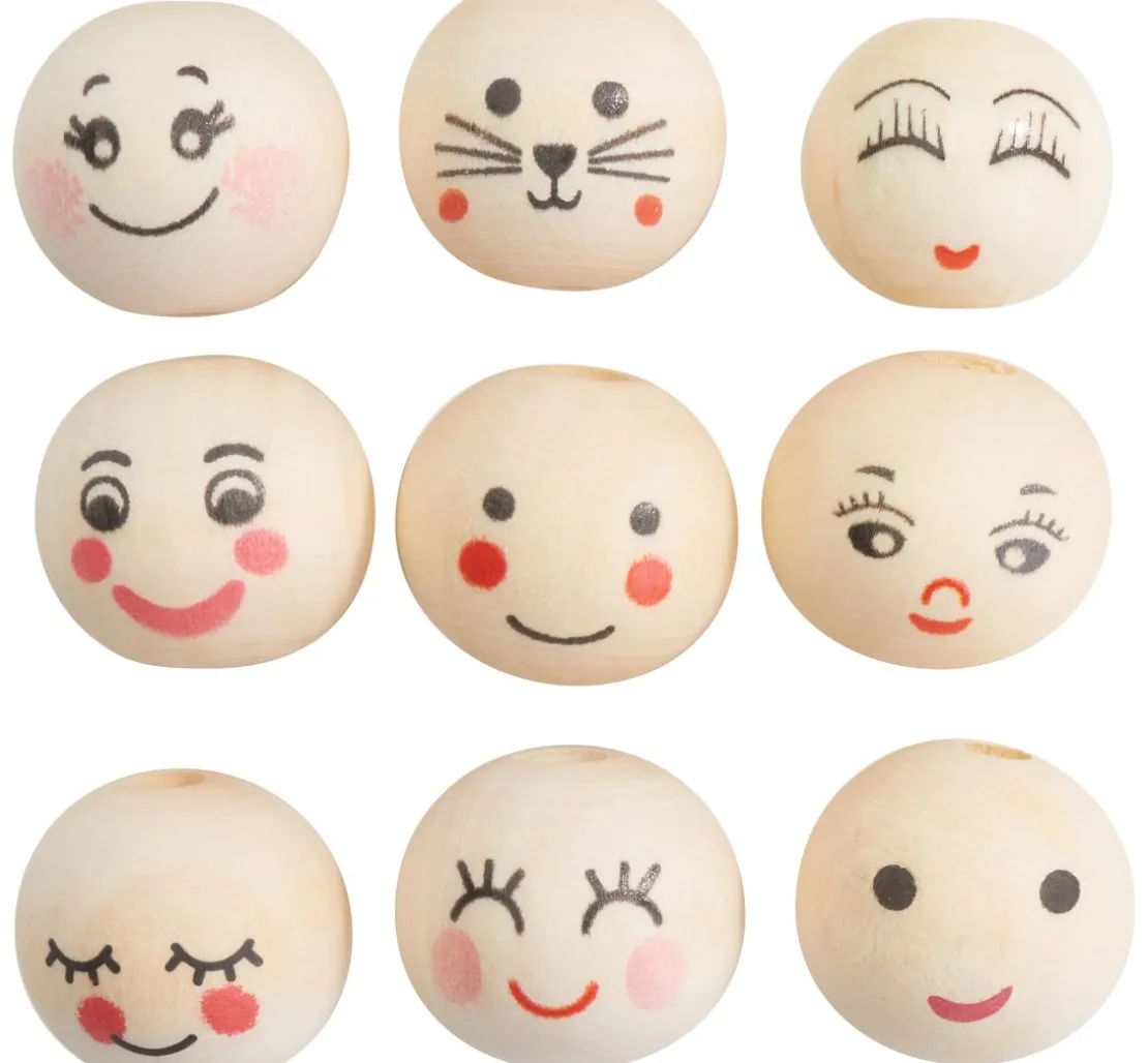 Die 32 Holzköpfe sind alle mit verschiedenen Gesichtsausdrücken bemalt und geben deinen Kunstwerken so eine einzigartige und individuelle Note. Durch den Außen-Ø von 2,0 cm und den Innen-Ø von 0,4 cm sind sie vielseitig einsetzbar und können zum Beispiel als Anhänger oder auch zur Gestaltung von Figuren verwendet werden.