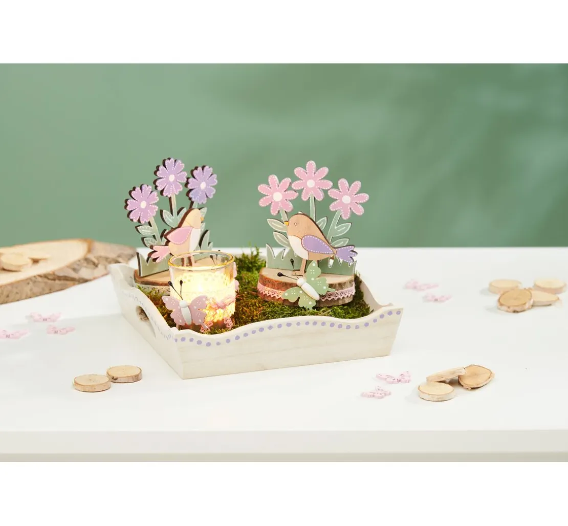 VBS Holz-Steckmotiv auf Rindenscheiben „Vögel und Blumen“ als Set mit 2 Stück. Jedes Motiv besteht aus 3 Teilen und wird zusammengesteckt und mit etwas Bastelkleber (nicht enthalten) fixiert. Die Steckmotive bestehen aus Rindenscheiben und Motiven aus Sperrholz. Die Größe beträgt ca. 8 x 8 x 12,3 cm.