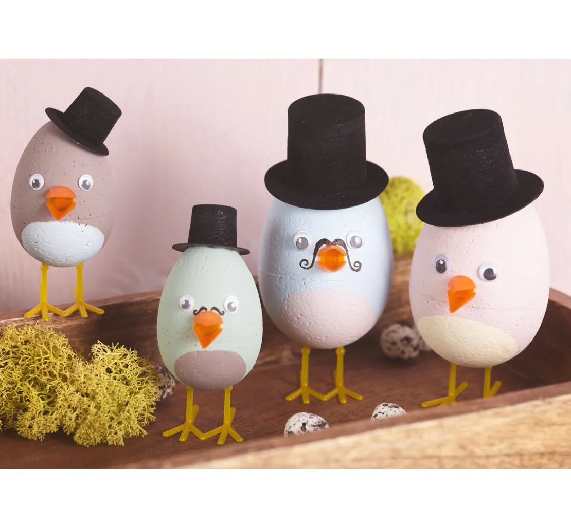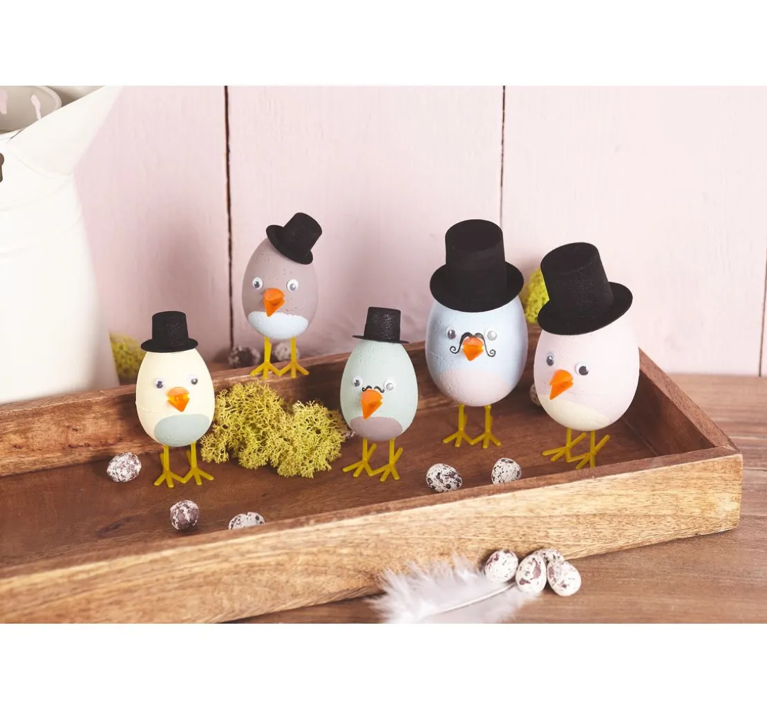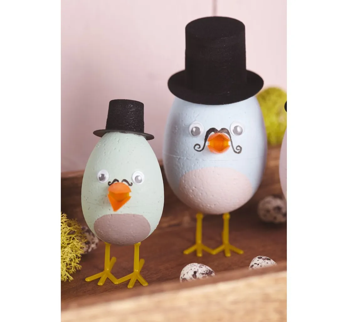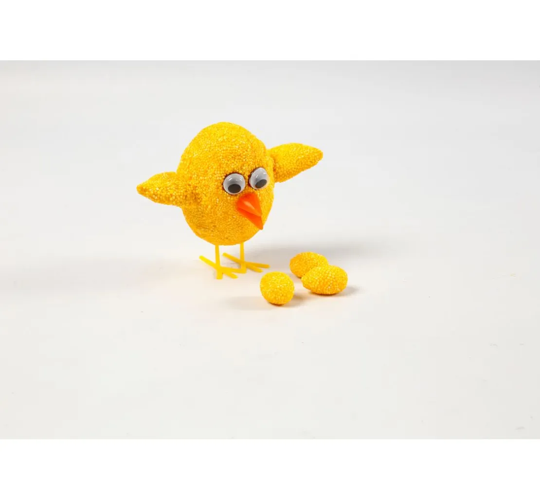 Der Schnabel misst inklusive Steckvorrichtung ca. 30 mm x 10 mm, der Schnabel allein ist ca. 14 mm und verleiht deinen kleinen Kunstwerken ein niedliches Aussehen. Die Füße, ca. 37 mm lang und 28 mm hoch mit einer Stecklänge von ca. 12 mm, sorgen für einen stabilen Stand deiner Küken. Ob aus Kunststoff- oder Styropor-Eiern, deine DIY-Vögel können nach Belieben bemalt, mit Foam Clay ummantelt oder mit Federn geschmückt werden.