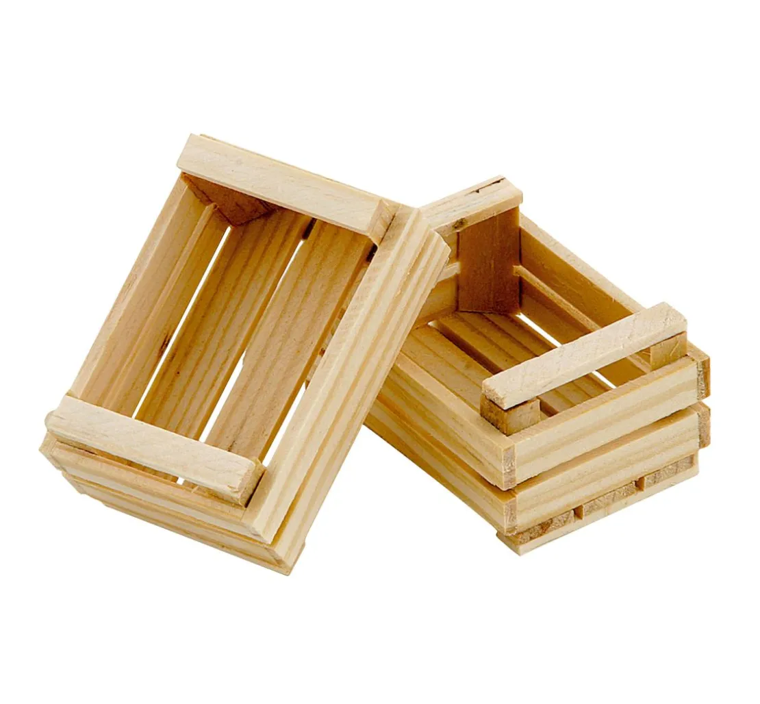 Die Miniatur Obststiege bestehen aus Holz und haben die Maße von ca. 4 cm Breite und 5 cm Länge. Das Holz ist unbemalt, somit können Sie die Mini-Obstkisten nach Wunsch selbst bearbeiten und individuell gestalten, z. B. bemalen oder bekleben.