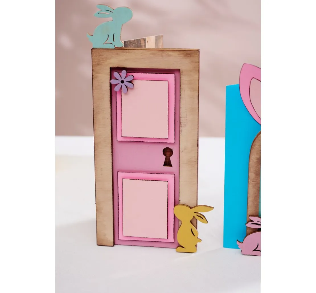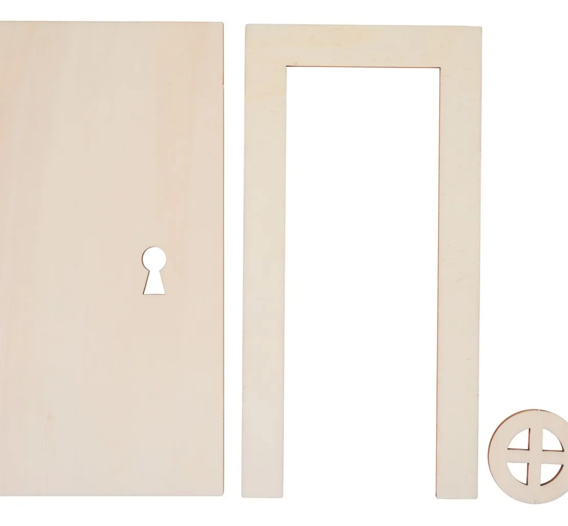 Das kleine Fenster lässt sich mit ein wenig Heißkleber nach Belieben an der Tür befestigen. Auch der separate Rahmen kann aufgeklebt werden. So entsteht ein 3D-Effekt. Zusätzlich können Bastelfarben, Glitter oder auch ein Brandmalpen zur individuellen Verzierungen genutzt werden.